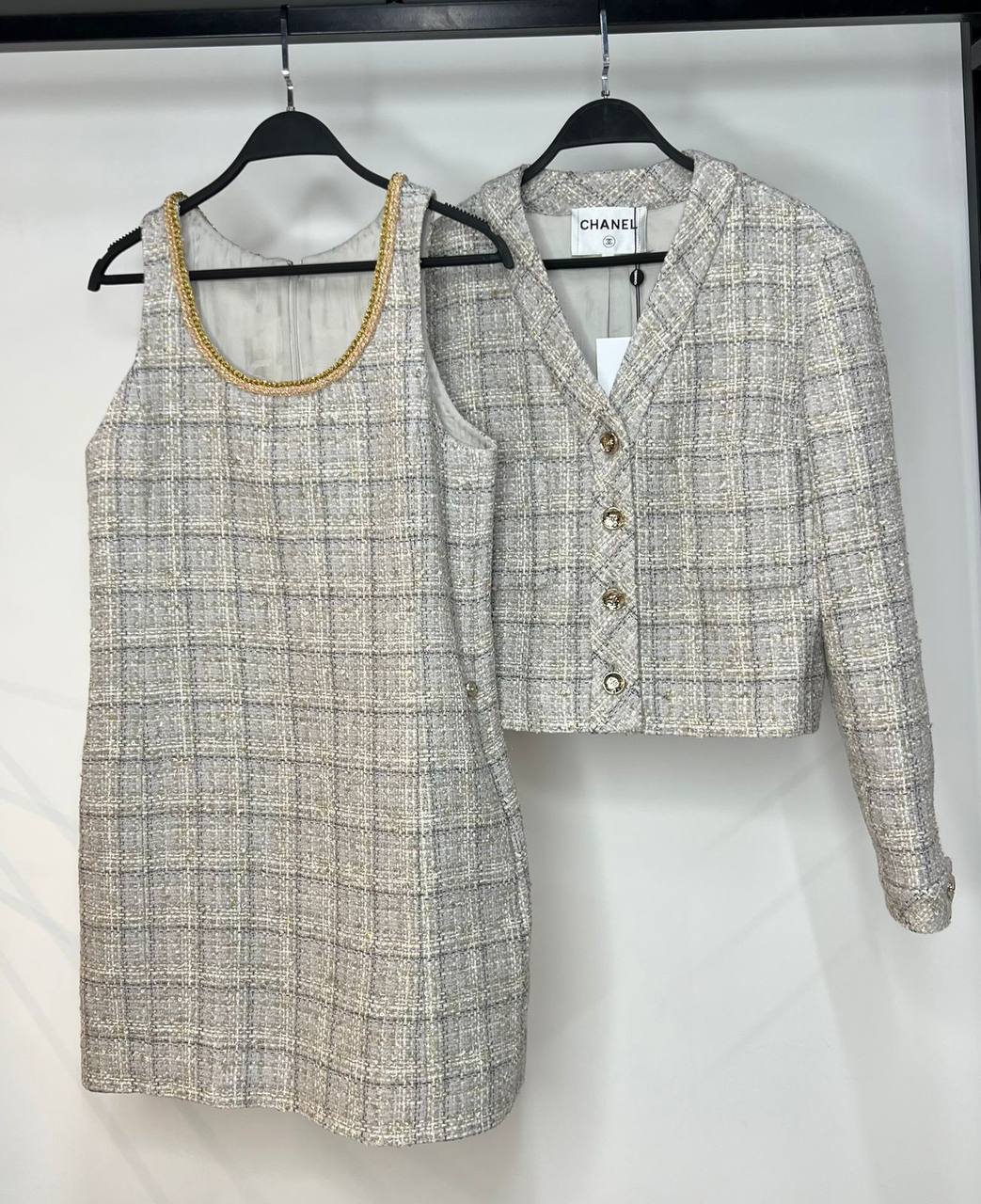 Изысканный женский костюм Chanel — это сочетание классического стиля и современных тенденций. Костюм состоит из элегантного платья-сарафана и укороченного жакета, создающих гармоничный и стильный образ. Этот комплект идеально подойдет для особых случаев и деловых встреч.