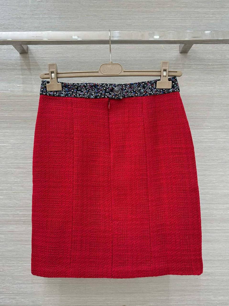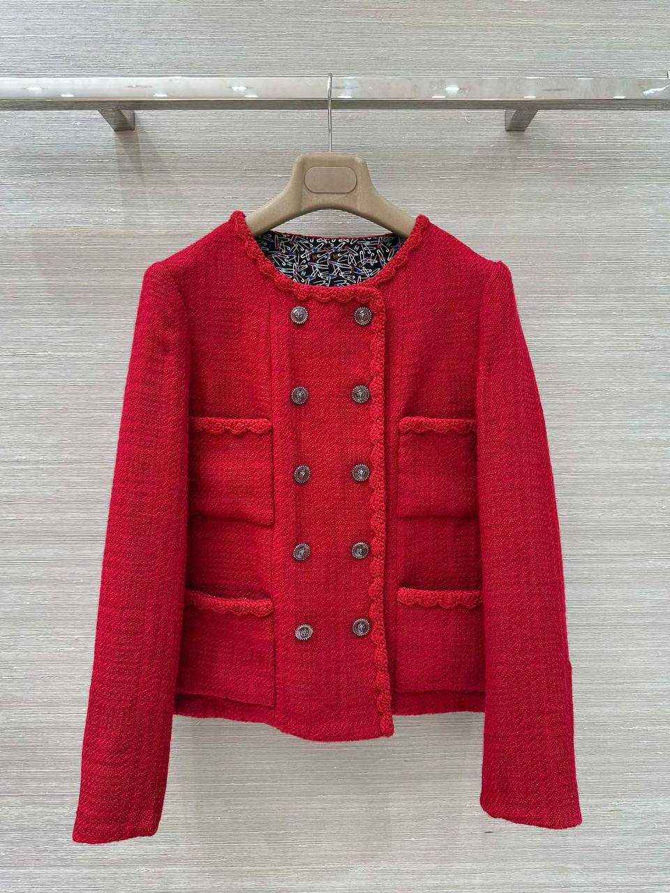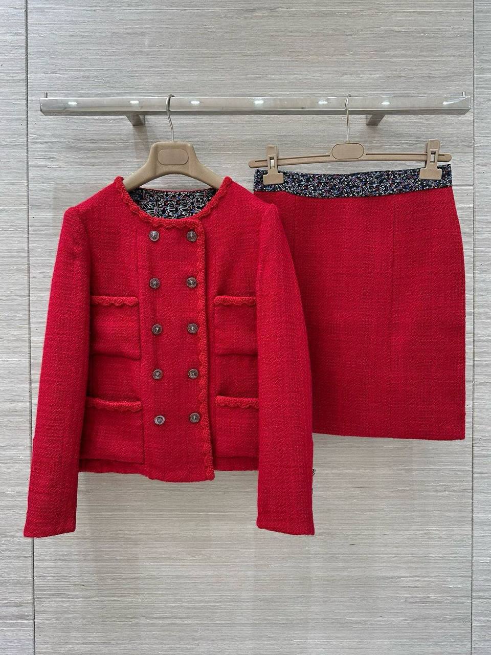 Этот женский костюм от Chanel – воплощение элегантности и стиля. Яркий красный цвет и классический твидовый материал делают его заметным и запоминающимся.