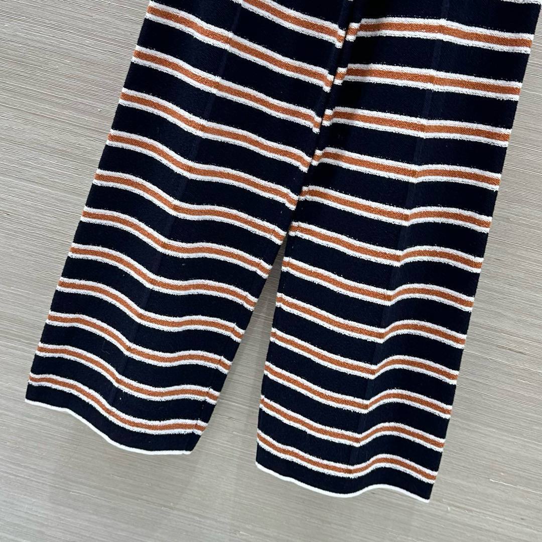 Женский костюм Chanel идеально подходит для создания элегантного и расслабленного образа. Костюм состоит из полосатого джемпера с отложным воротником и широких брюк на кулиске.