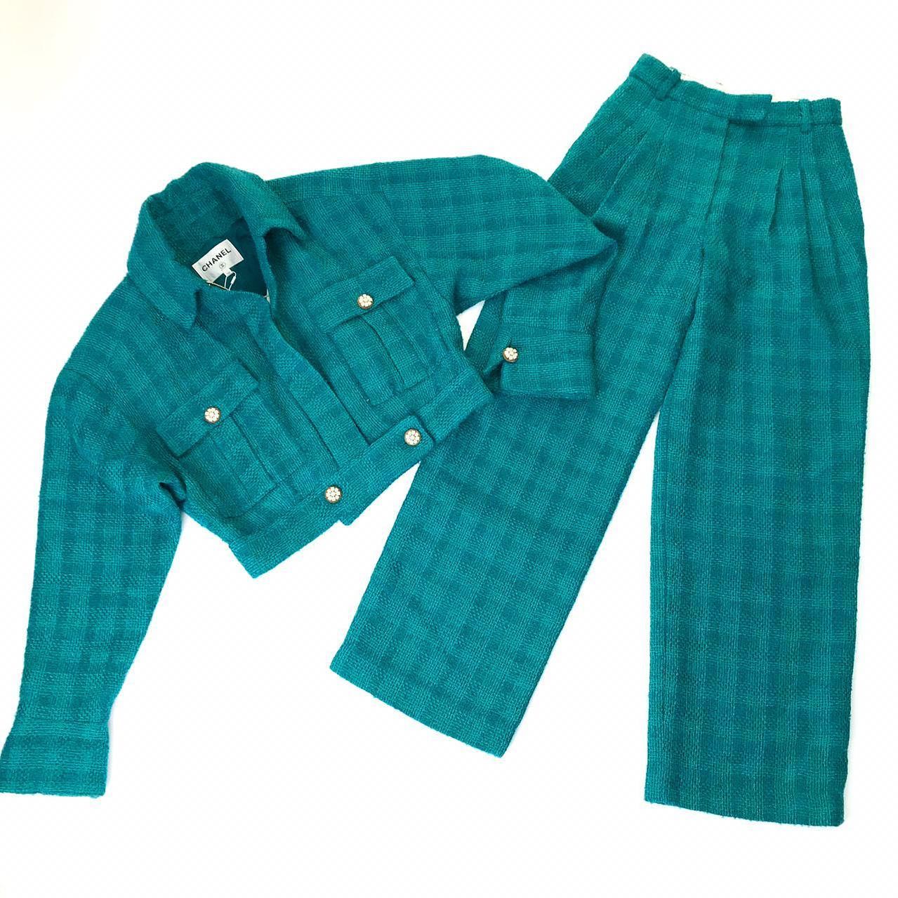 Этот женский костюм Chanel LUX-31076 представляет собой элегантный выбор для современной женщины, ценящей стиль и качество. Комплект, состоящий из укороченной жакетки с накладными карманами и брюк классического кроя, выполнен в насыщенном бирюзовом цвете и украшен клетчатым узором. Дизайн костюма подчеркивает изысканность и утонченный вкус.