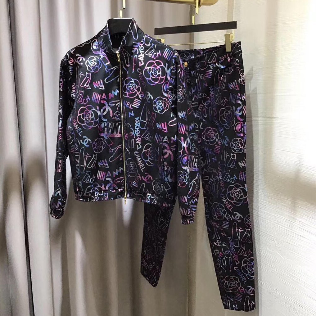 Костюм женский Chanel LUX-31665 представляет собой стильный комплект, состоящий из куртки и брюк, выполненный в современном стиле. Насыщенный черный фон изделия украшен ярким принтом с изображением логотипов бренда, узнаваемых камелий и графических элементов, выполненных в переливающихся оттенках розового, фиолетового и синего. Этот костюм идеально подходит для создания эффектных повседневных образов, подчеркивая индивидуальность и изысканный вкус его обладательницы.