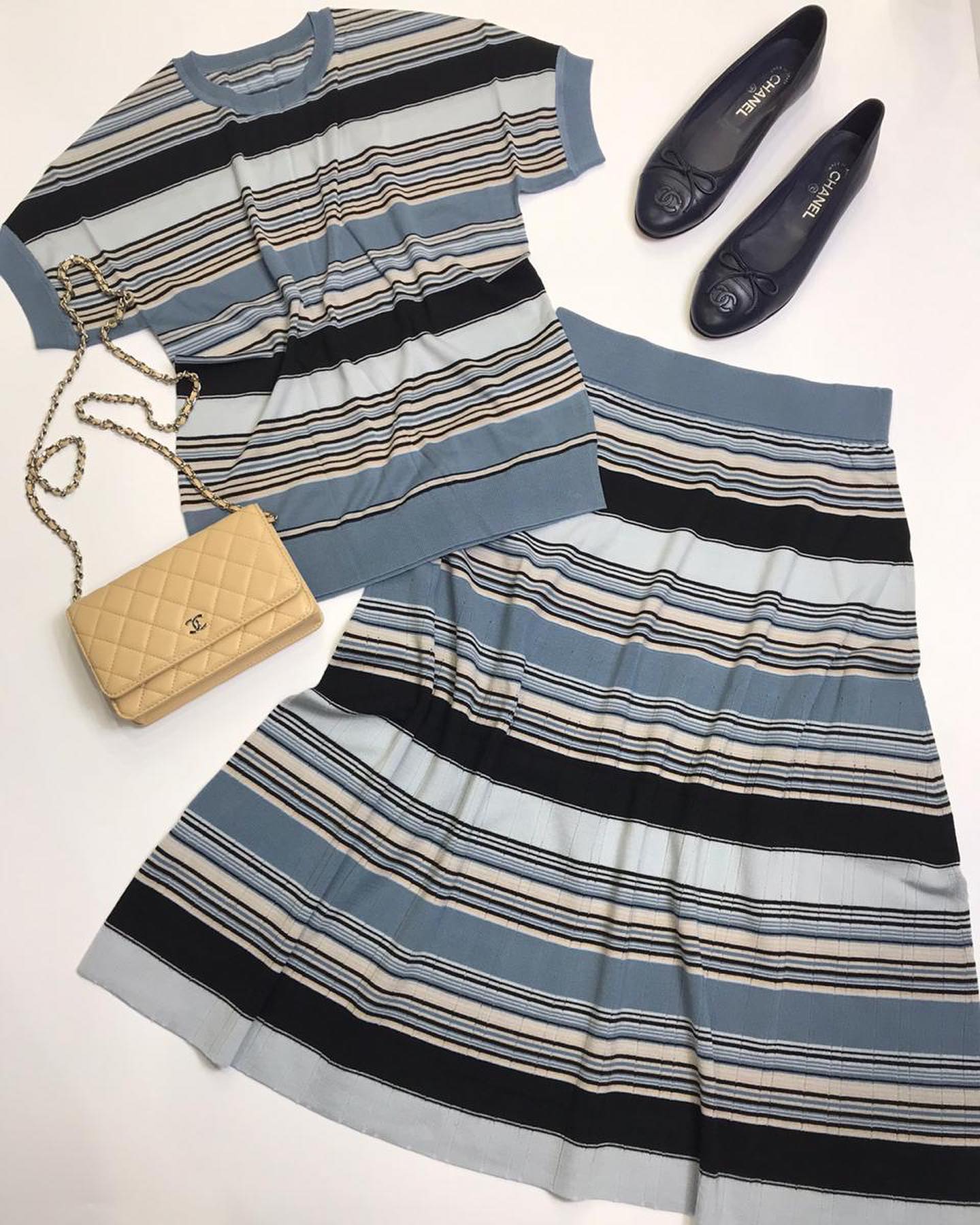 Костюм женский Chanel LUX-35699 представляет собой элегантный комплект, состоящий из топа и юбки, выполненных в стильном горизонтальном полосатом дизайне. Оттенки синего, черного и бежевого создают изысканную цветовую палитру, которая подойдет для различных случаев. Этот костюм идеально сочетается с сумкой и обувью бренда, образуя завершенный образ.