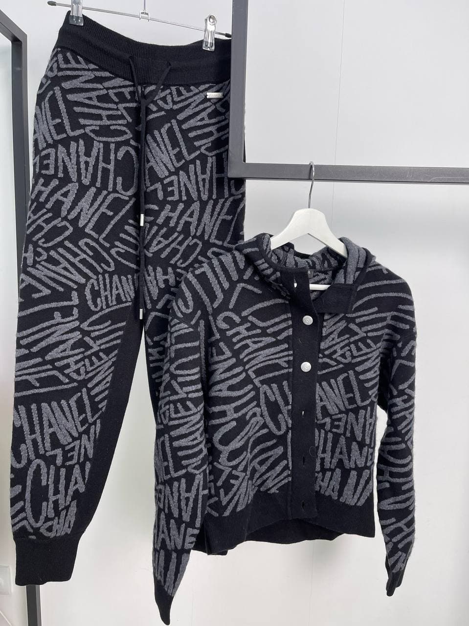 Представленный женский костюм Chanel LUX-59681 — это элегантный комплект, сочетающий в себе спортивный крой и узнаваемый стиль бренда. Дизайн модели выполнен в современном урбанистическом стиле, что делает его идеальным выбором для создания эффектных повседневных образов. Комплект состоит из удобных брюк и кардигана с капюшоном, оба предмета украшены контрастным принтом с логотипами Chanel, создавая динамичный и модный вид.