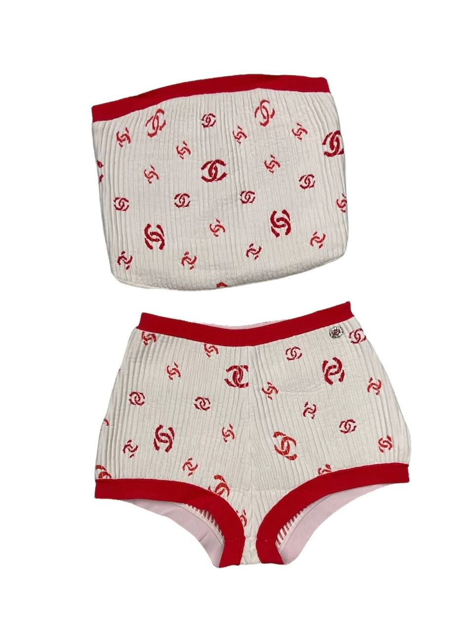 Этот женский костюм Chanel LUX-68117 представляет собой комплект из топа-бандо и шорт, выполненный в узнаваемом стиле бренда. Белый фон изделия украшен повторяющимся принтом из красных логотипов Chanel, что придает ему эксклюзивный вид. Костюм идеально подходит для создания расслабленных, но стильных образов.