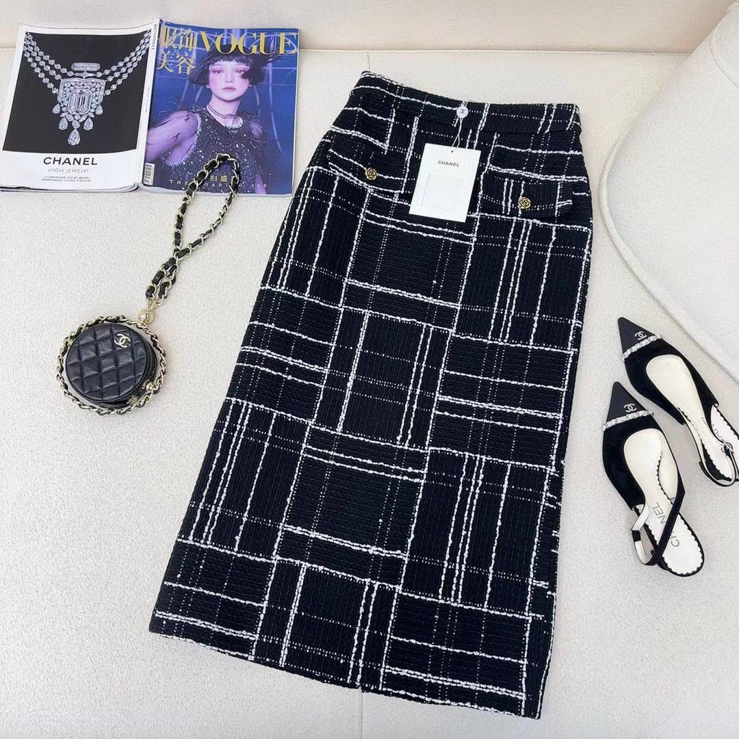 Костюм женский Chanel LUX-98268 — это элегантный твидовый костюм, выполненный в классическом стиле. Преобладающий черный цвет с белыми линиями создает графичный узор в клетку. Жакет костюма украшен золотыми пуговицами.