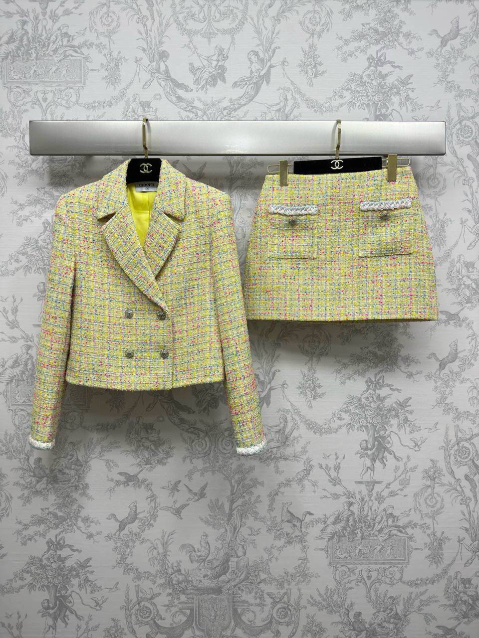 Костюм женский Chanel LUX-103722 - это элегантный твидовый костюм, сочетающий в себе классический стиль Chanel и современный крой. Комплект состоит из жакета и юбки. Яркий желтый цвет с разноцветными вкраплениями придает изделию особую выразительность и делает его подходящим для различных мероприятий.
