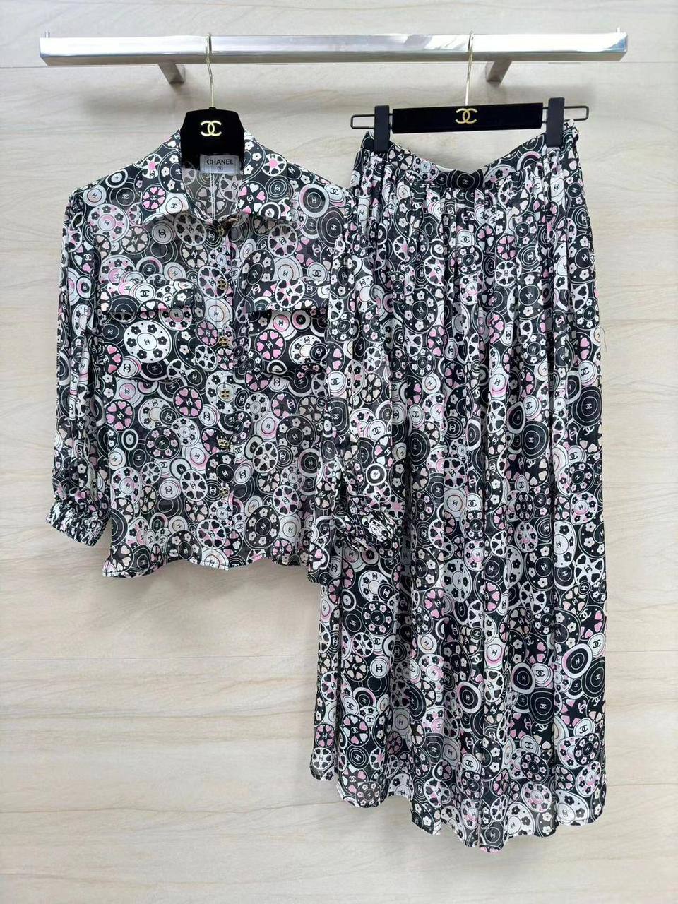 Костюм женский Chanel LUX-104394 представляет собой элегантный ансамбль, выполненный в фирменном стиле Chanel. Комплект состоит из рубашки с длинными рукавами и юбки. Дизайн включает в себя узор в виде повторяющихся геометрических элементов, сочетающих чёрный, белый и розовый цвета. Этот костюм идеально подходит для создания стильного и запоминающегося образа.