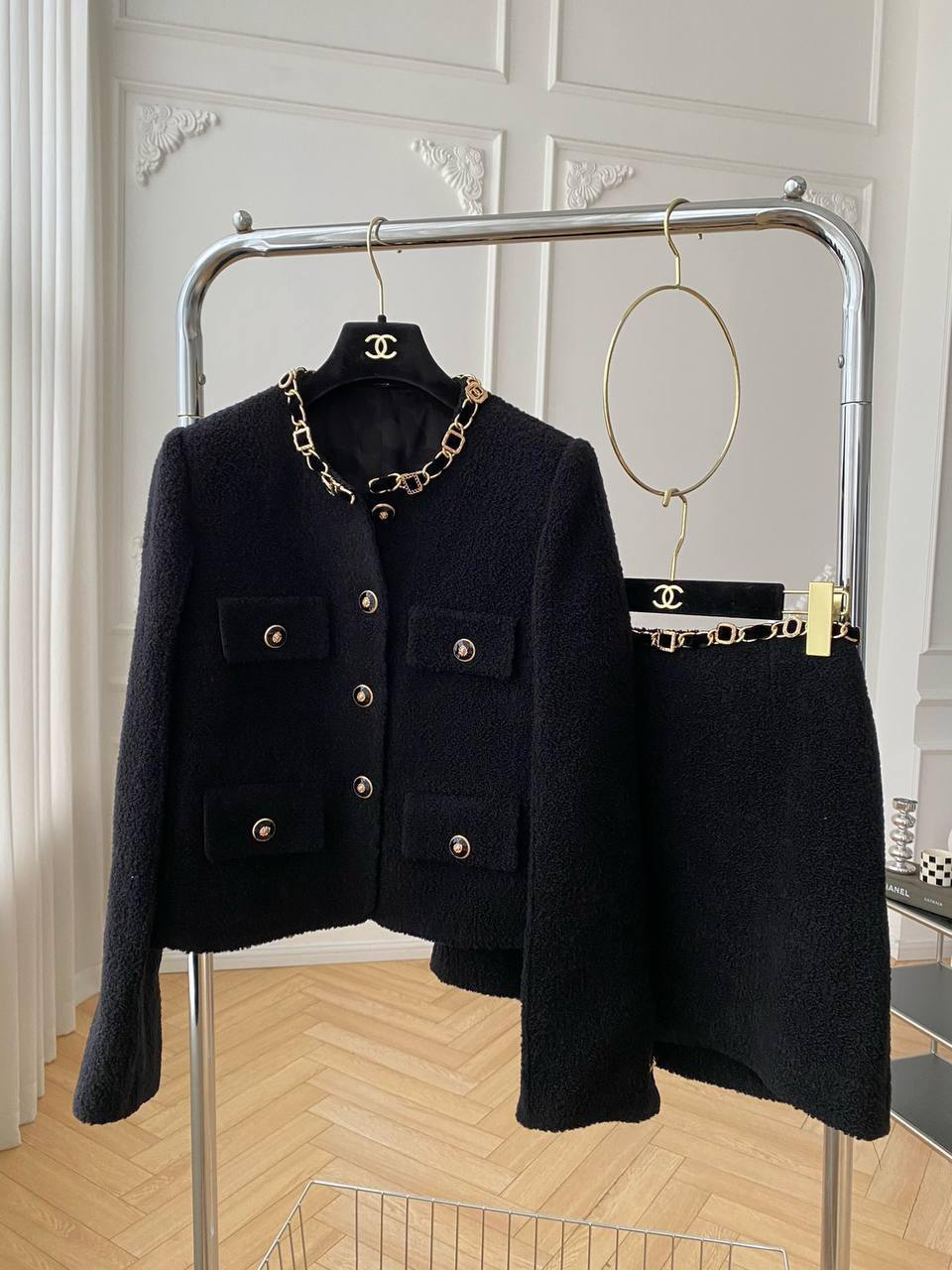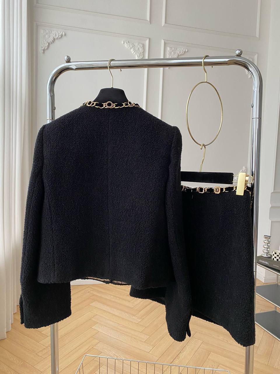 Костюм женский Chanel LUX-111573 представляет собой элегантный комплект, выполненный в классическом стиле Chanel. Комплект состоит из жакета и юбки, выполненных в черном цвете. Текстура ткани придает изделию особую привлекательность.