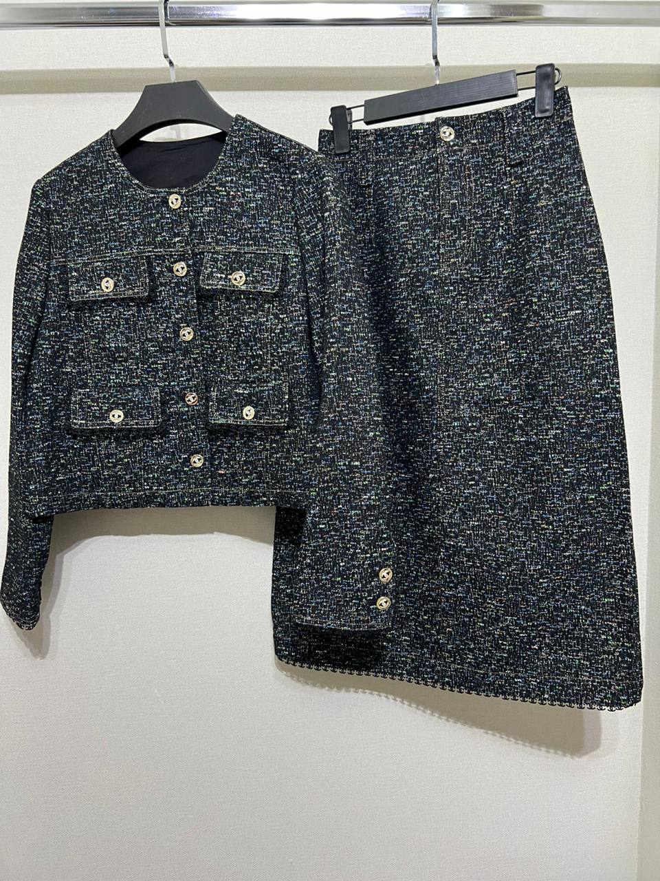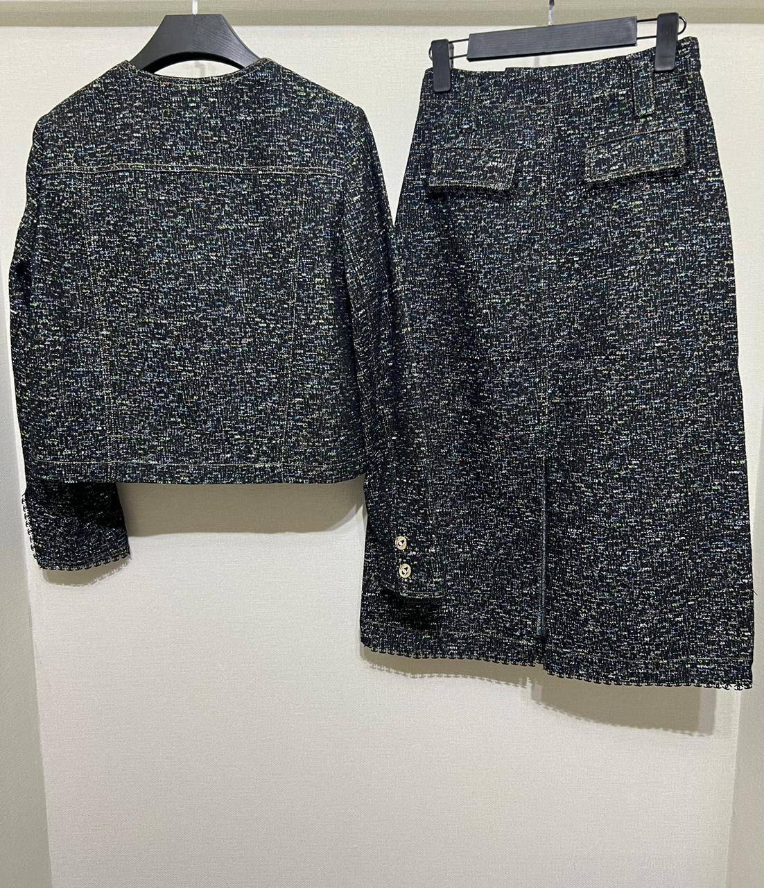 Костюм женский Chanel LUX-112137 — это элегантный комплект, который состоит из жакета и юбки. Комплект выполнен в классическом стиле Chanel, имеет твидовую текстуру, преимущественно в темных тонах с добавлением цветных нитей. Такой костюм подойдет для создания стильного и утонченного образа.