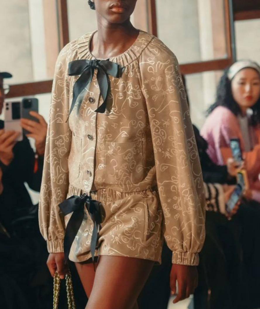 Костюм женский Chanel LUX-113898 — воплощение элегантности и стиля от известного бренда. Этот костюм представлен в нежном бежевом цвете с графическим принтом, дополненным черными бантами на жакете и шортах, создавая утонченный и изысканный образ. Идеален для создания как повседневных, так и нарядных ансамблей, подчеркивая индивидуальность и хороший вкус.