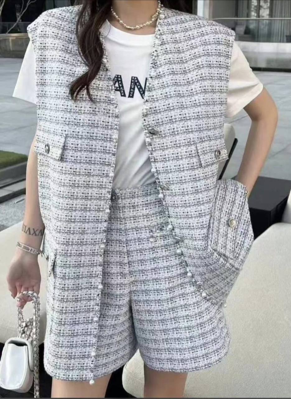 Костюм женский Chanel LUX-117305 – это элегантный ансамбль, выполненный в классическом стиле. Он включает в себя жилет и шорты, выполненные в бело-сером цвете с твидовой текстурой. Костюм идеально подойдет для создания стильного и утонченного образа.