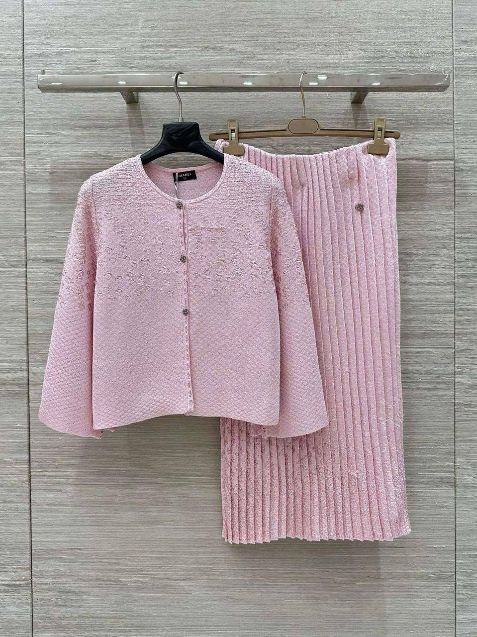 Костюм женский Chanel LUX-117611 — это воплощение элегантности и изысканности. Розовый костюм, состоящий из жакета и юбки, идеально подойдет для создания утонченного образа. Жакет с круглым вырезом и юбка-плиссе создают гармоничный ансамбль, который подчеркнет вашу женственность и стиль.