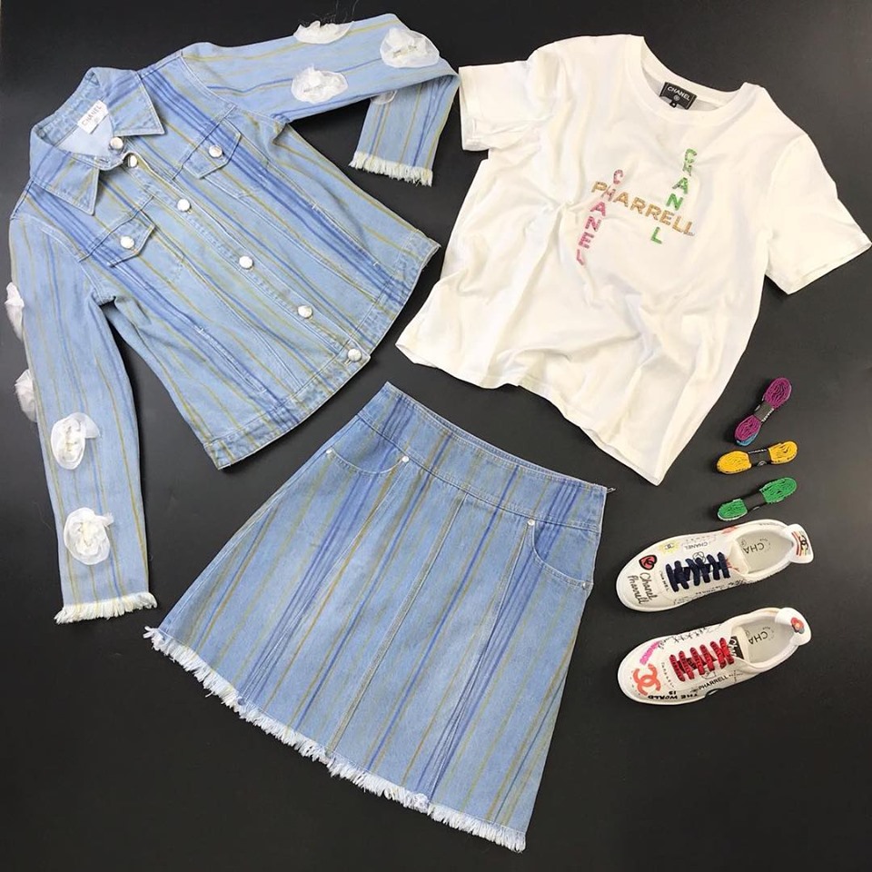Этот женский юбочный костюм Chanel LUX-13022 представляет собой стильный комплект, состоящий из джинсовой куртки и юбки, выполненный в нежном голубом цвете с вертикальными полосками. Дизайн дополнен белыми аппликациями и бахромой на краях, что придает ему особую изысканность. Белая футболка с принтом от Chanel гармонично завершает образ, создавая модный и актуальный лук.