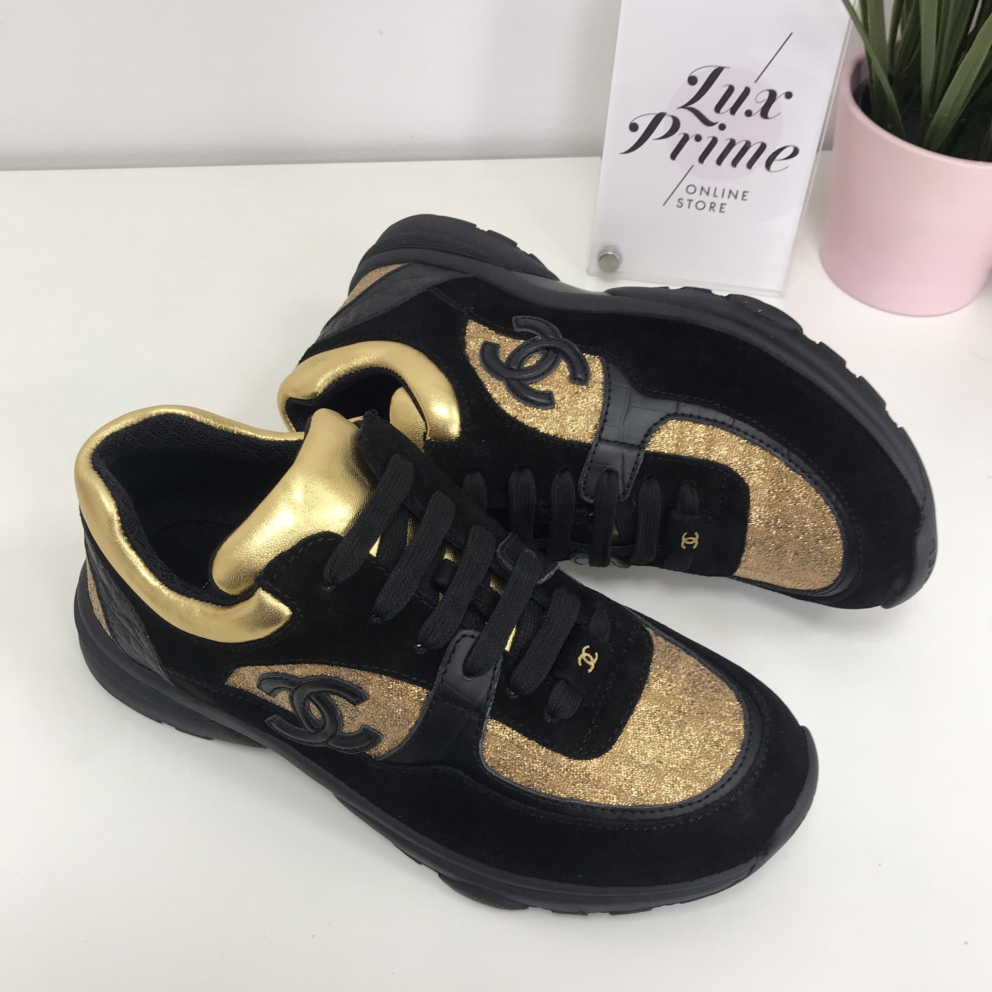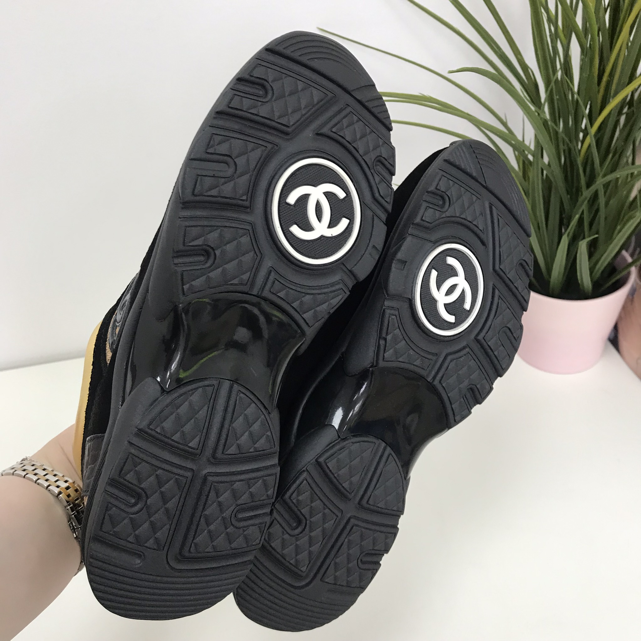 Кроссовки женские Chanel LUX-17245 – это стильная и комфортная обувь, сочетающая в себе элегантность и спортивный дизайн. Черный цвет с золотистыми акцентами придает модели роскошный вид, делая ее универсальным дополнением к разнообразным образам. Эти кроссовки идеально подойдут для создания модных повседневных или спортивных комплектов.