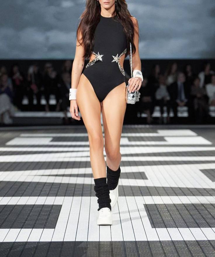 Представлен купальник Chanel LUX-115196, выполненный в элегантном стиле. Черный купальник с декором в виде звезд, расположенных на груди и украшенных по бокам, создаёт изысканный образ. Идеально подойдет для пляжа или бассейна.