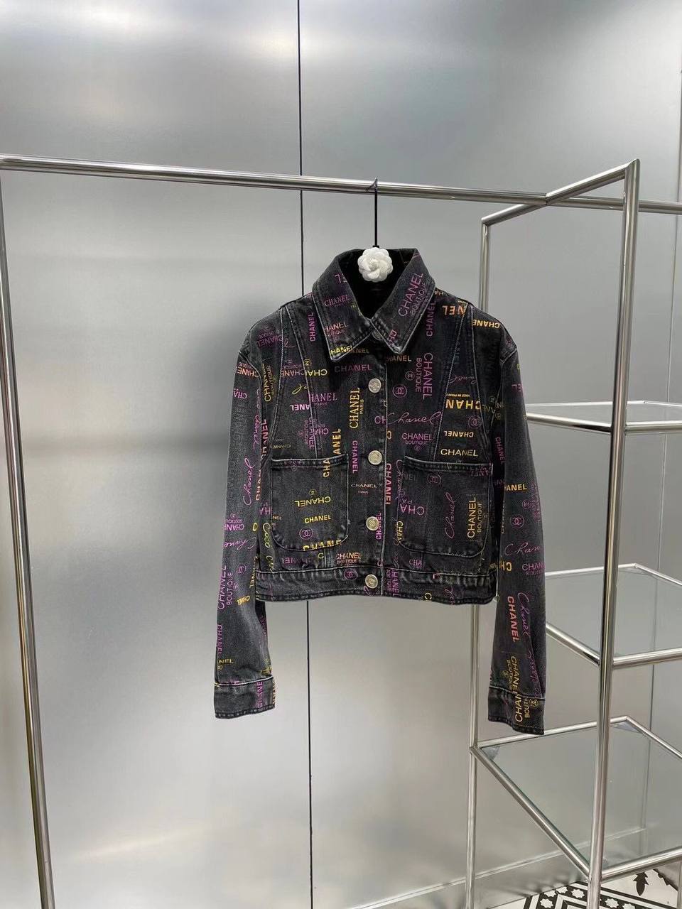 Данная женская куртка Chanel LUX-65976 представляет собой стильное изделие из денима с оригинальным принтом, выполненным в виде логотипов и названий бренда. Свободный крой и классический дизайн делают ее универсальной основой для множества образов, от повседневных до более элегантных.