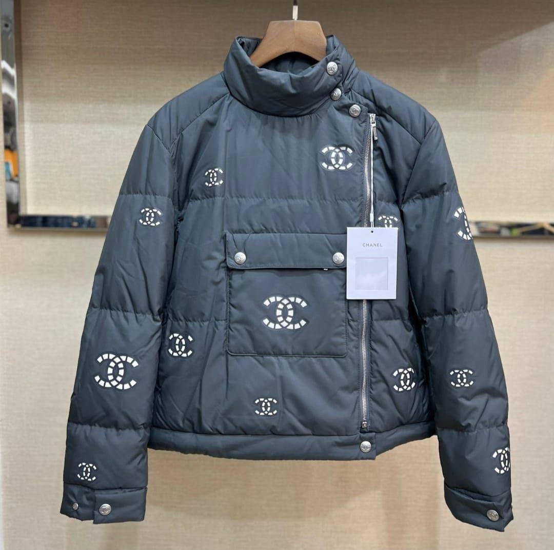 Куртка женская Chanel LUX-112094, представленная на изображении, выполнена в спортивном стиле и имеет графитовый цвет. Куртка имеет круглый воротник-стойку, застежку-молнию и множество знаковых логотипов бренда. Предназначена для повседневного использования в холодную погоду.