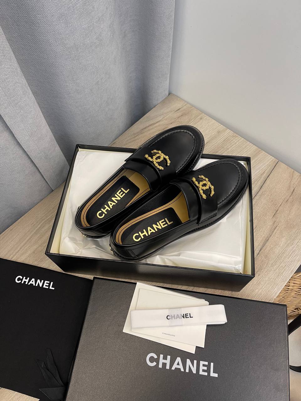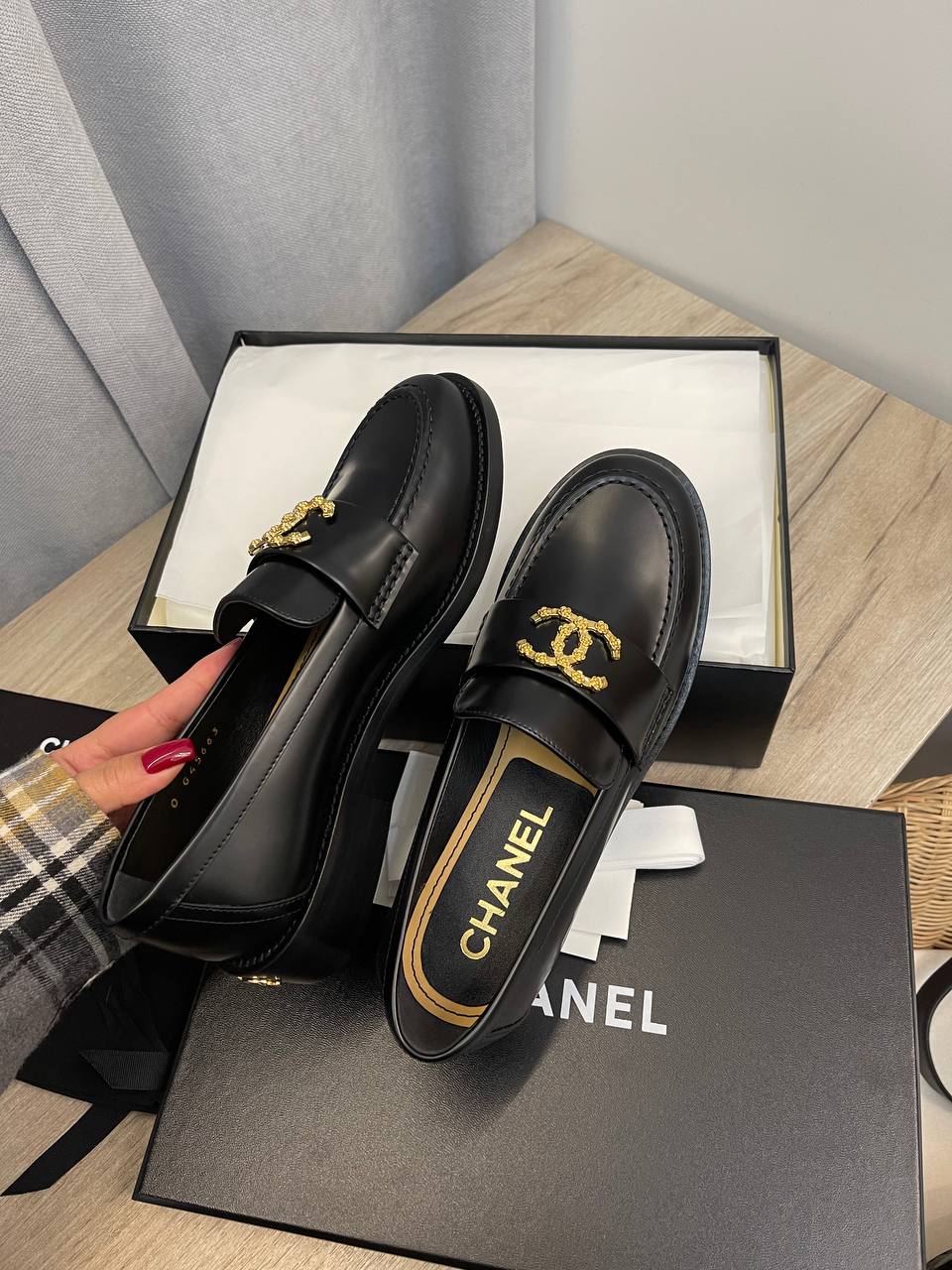 Лоферы Chanel LUX-111242 - это классическая модель обуви от известного бренда. Они выполнены в черном цвете, с золотистым логотипом на передней части. Лоферы имеют элегантный вид и подойдут для создания различных образов.