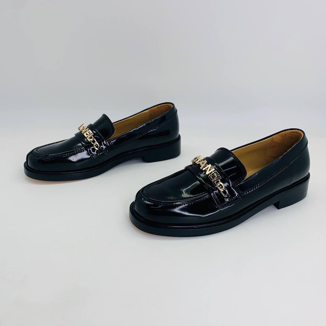 Эти лакированные лоферы Chanel LUX-47769 выполнены в классическом стиле и идеально дополнят как повседневный, так и элегантный образ. Декоративная золотая цепочка с тиснением названия бренда придает обуви изысканность и узнаваемость. Удобная колодка и устойчивый каблук обеспечивают комфорт при ходьбе в течение всего дня.