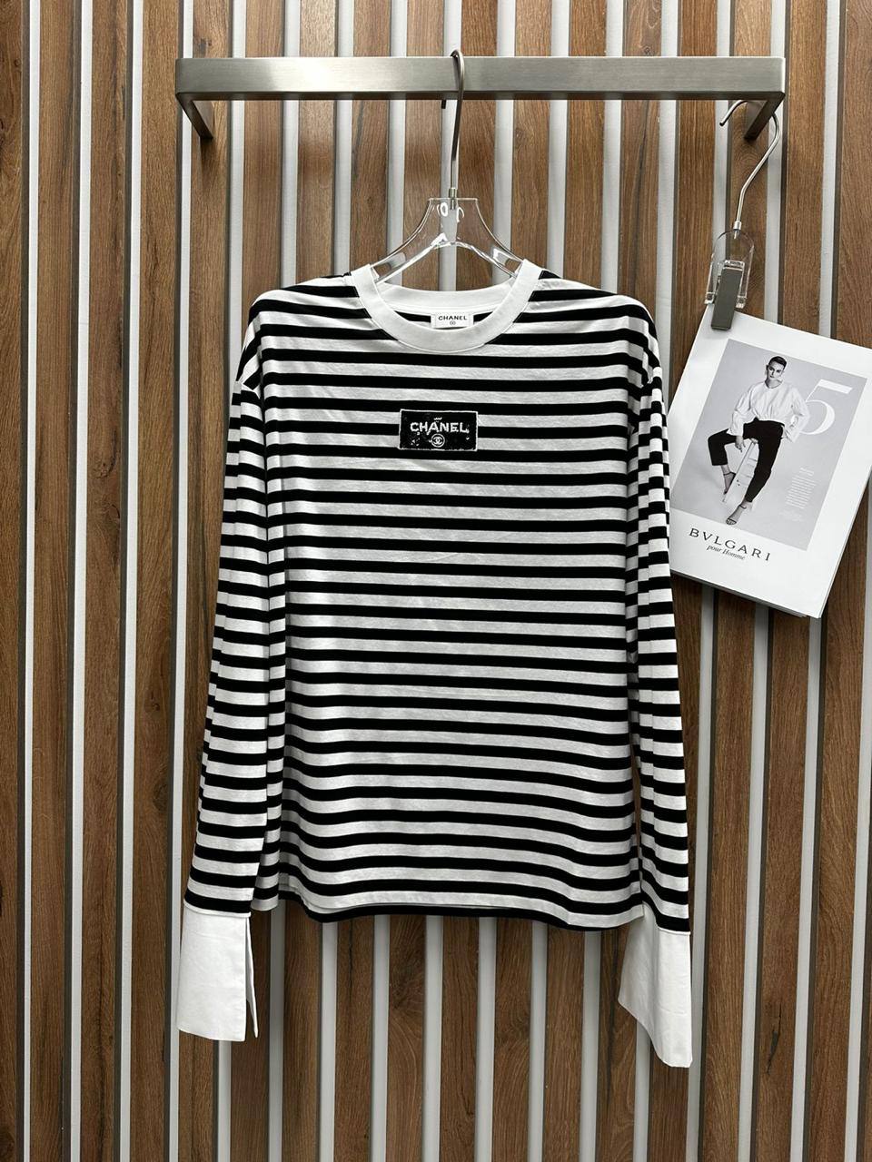 Лонгслив Chanel LUX-104868 представляет собой стильный предмет гардероба от известного бренда. Модель выполнена в полоску черно-белого цвета, с контрастными белыми манжетами. Лонгслив станет отличным выбором для создания повседневных образов.