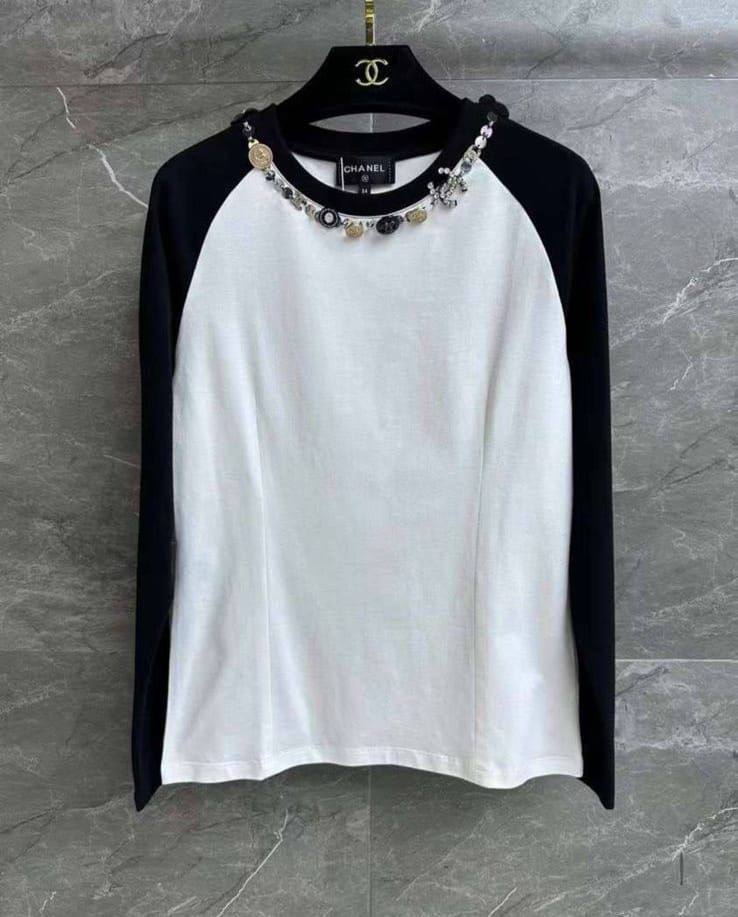 Лонгслив Chanel LUX-95328 представляет собой стильную кофту с длинными рукавами, выполненную в контрастных цветах: белом и черном. Дизайн включает в себя изысканный декор в области горловины, придающий изделию особый шарм. Этот лонгслив станет отличным выбором для создания элегантных и современных образов.
