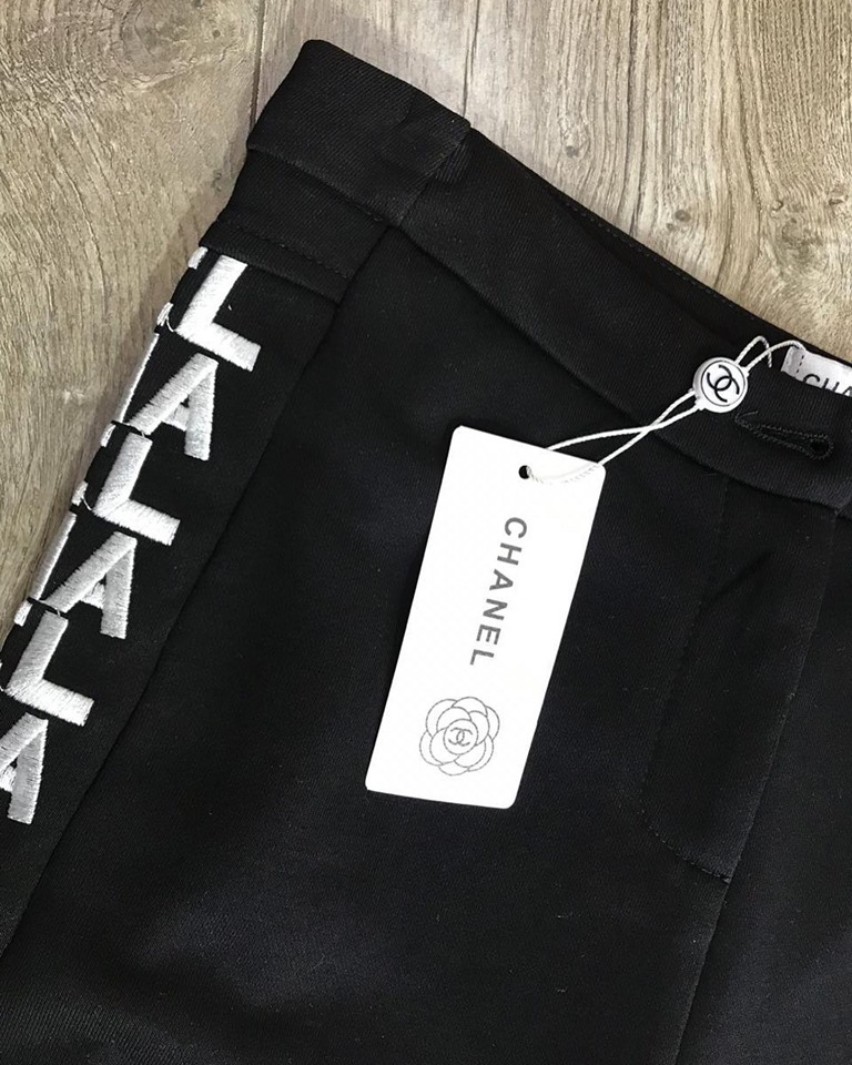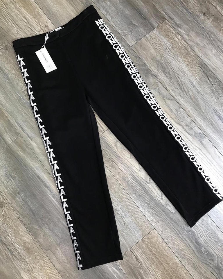 Лосины Chanel LUX-17742 – это стильный выбор для современного гардероба. Черные лосины украшены контрастной белой надписью по бокам, что придает им узнаваемый брендовый вид. Они идеально подойдут для создания спортивных или повседневных образов.