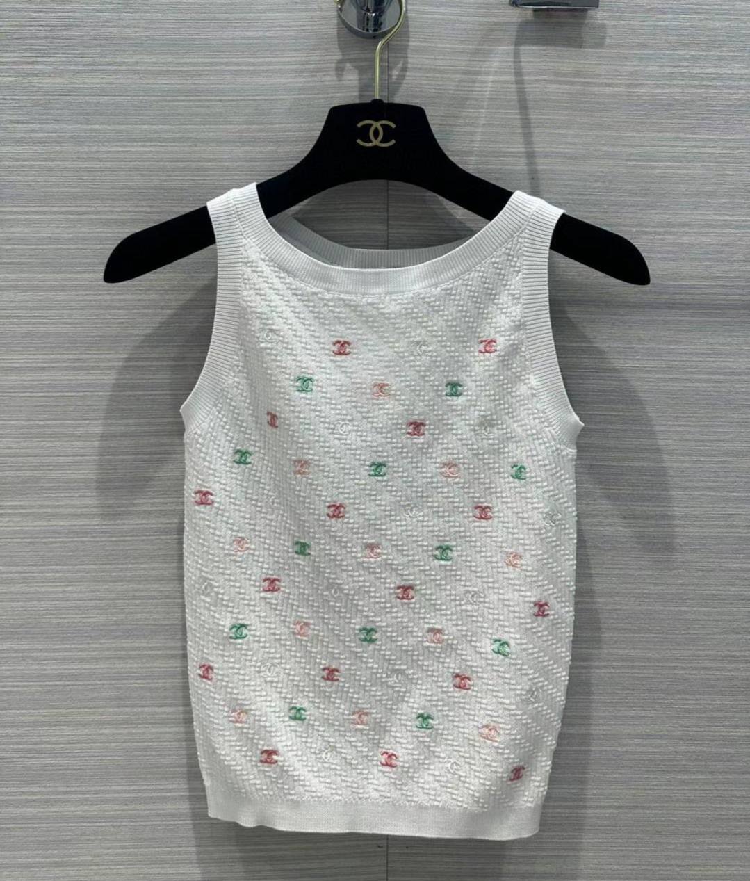 Майка Chanel LUX-87742 представляет собой стильный предмет гардероба. Она выполнена в белом цвете с текстурированным узором. Декорирована разноцветными логотипами. Идеально подходит для создания элегантных и современных образов.