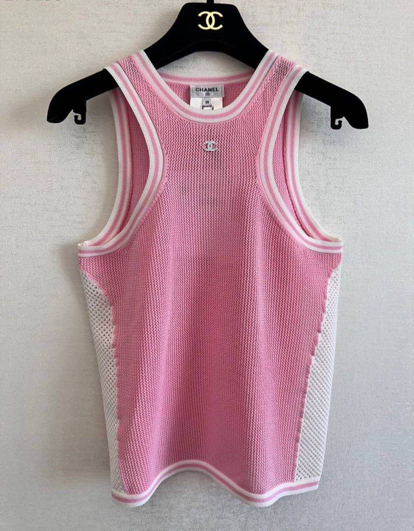 Майка Chanel LUX-104649 представляет собой спортивный топ-майку от бренда Chanel. Изделие выполнено в розовом цвете с белыми полосами и вставками, имеет трикотажную текстуру и логотип бренда на груди. Она подходит для повседневной носки, активного отдыха или создания стильных образов.