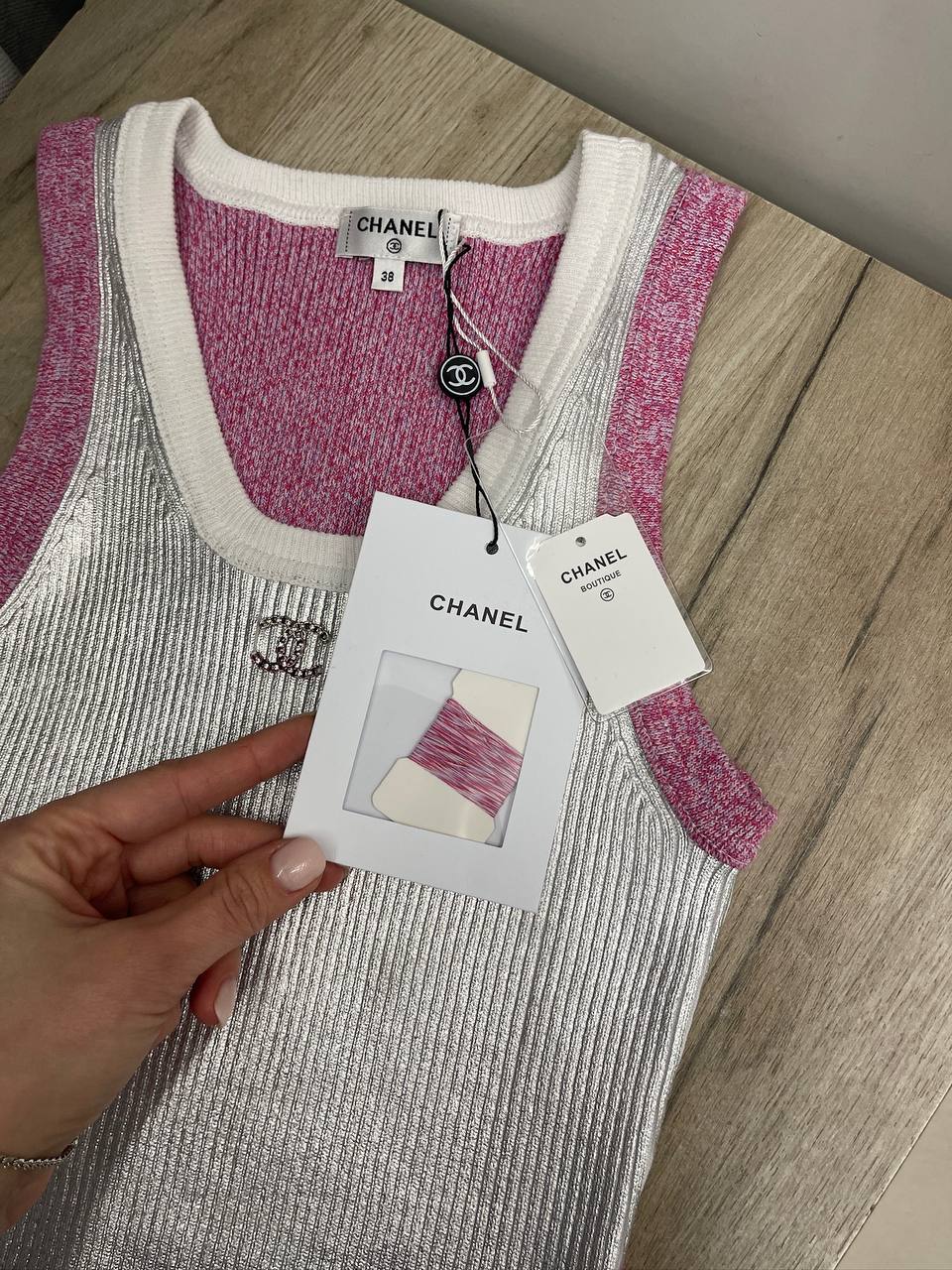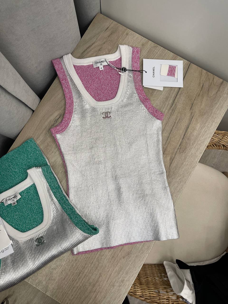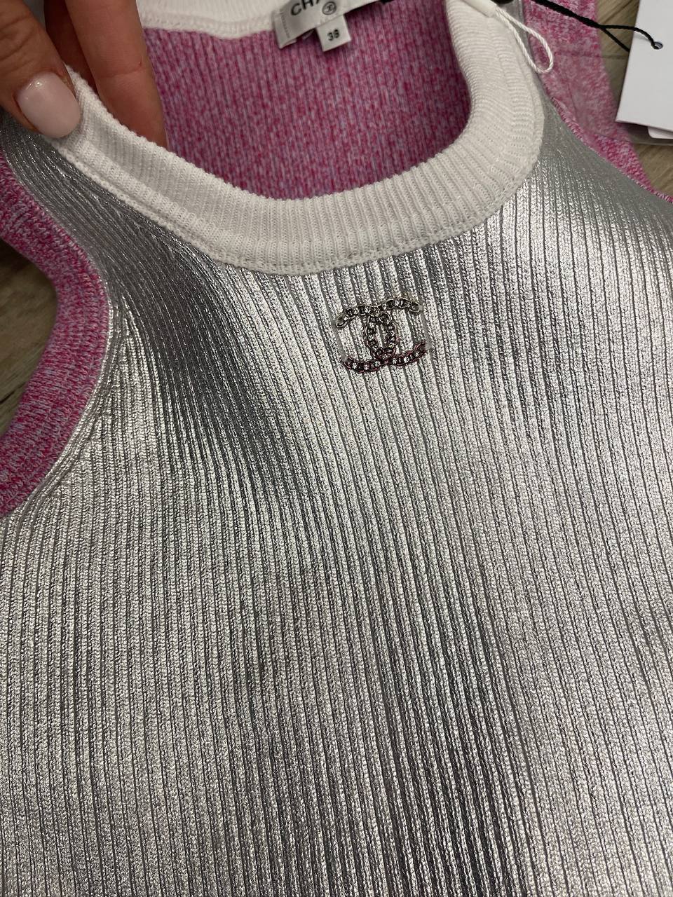Майка Chanel LUX-113831 – это воплощение стиля и элегантности от известного бренда. Майка выполнена в серебристом цвете с розовыми и белыми деталями, создавая современный и привлекательный образ. Идеально подходит для создания стильных повседневных и вечерних образов.