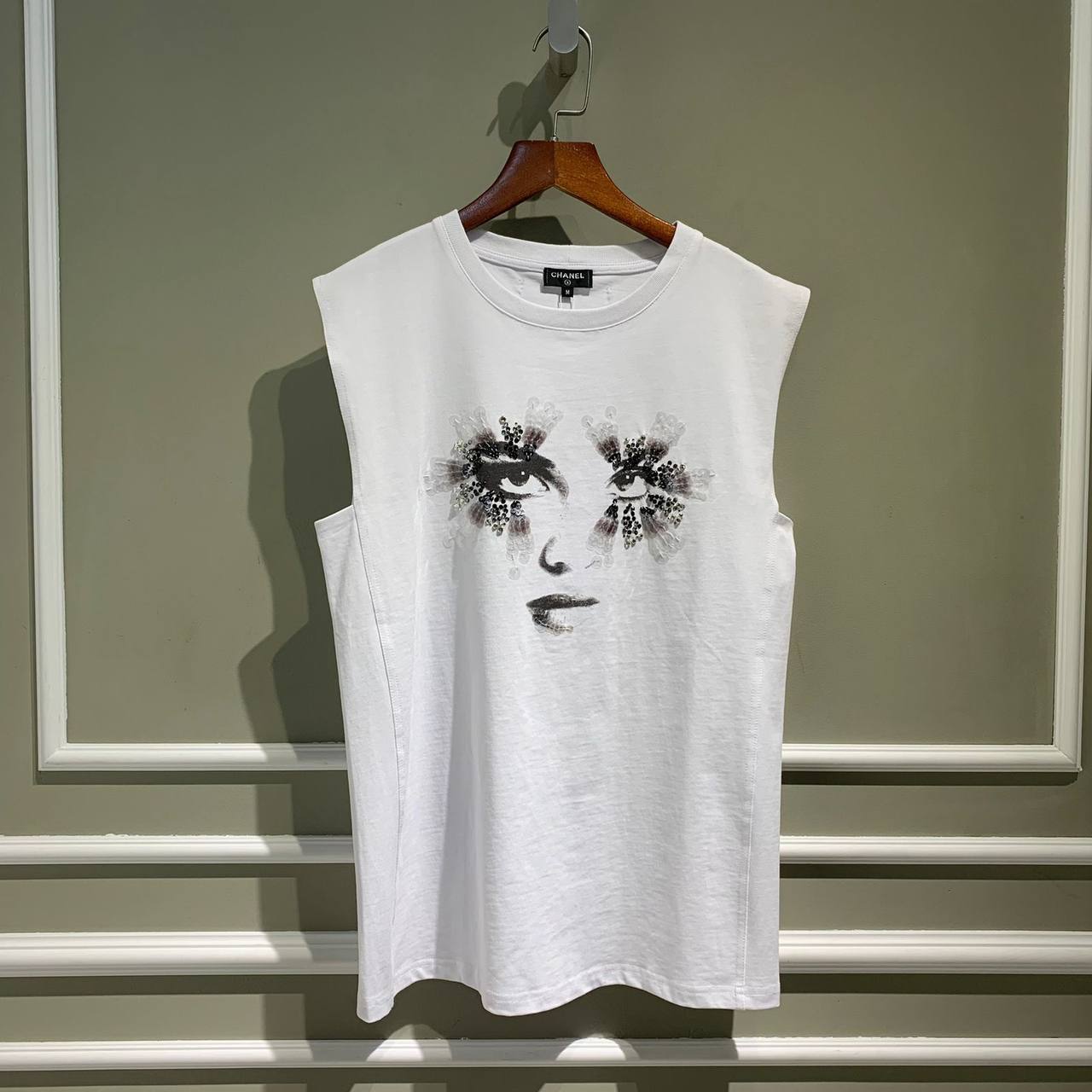 Майка Chanel LUX-70616 — это стильный предмет гардероба от известного бренда. Она выполнена в белом цвете с ярким принтом в виде женского лица с элементами декора. Безрукавка подойдет для создания как повседневных, так и более нарядных образов.