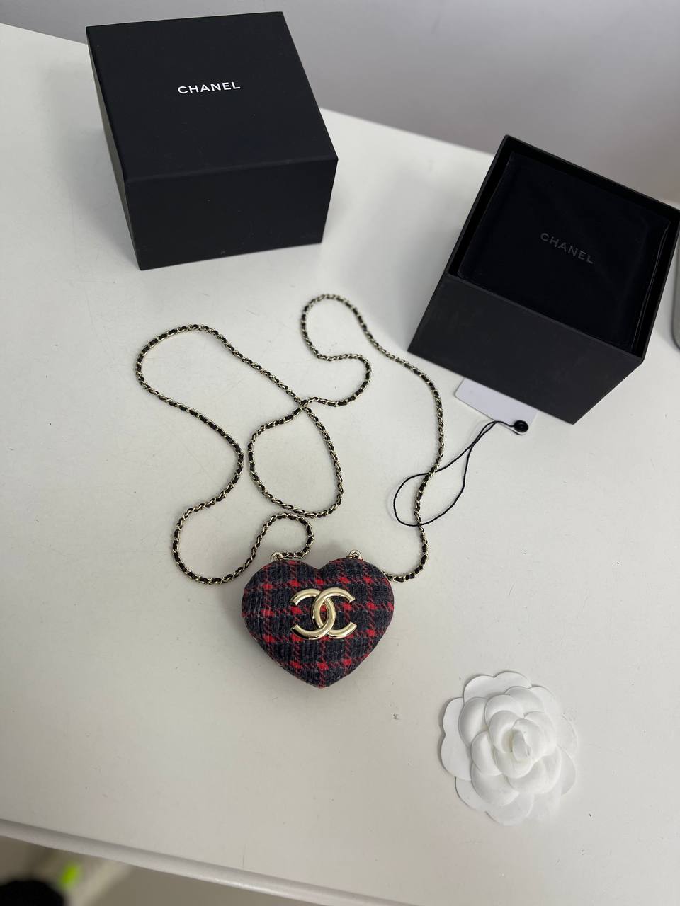 Минодьер Chanel LUX-75581 — это стильный аксессуар в форме сердца, выполненный в клетчатом дизайне. Он представляет собой миниатюрную сумочку на цепочке, которая добавит изысканности любому образу. Этот минодьер станет прекрасным дополнением к вечернему наряду.