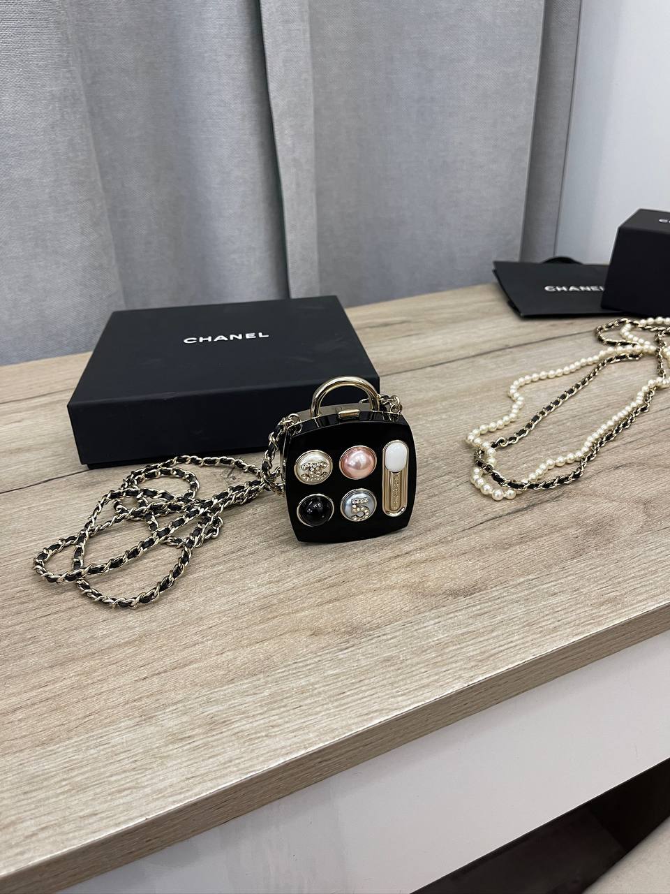 Минодьер Chanel LUX-103345 – это элегантный аксессуар от известного бренда, сочетающий в себе функциональность и изысканный стиль. Черный корпус с декоративными элементами и золотистой фурнитурой подчеркивает роскошь. Небольшой размер делает его идеальным для вечерних выходов, а цепочка позволяет носить его на плече или через плечо.