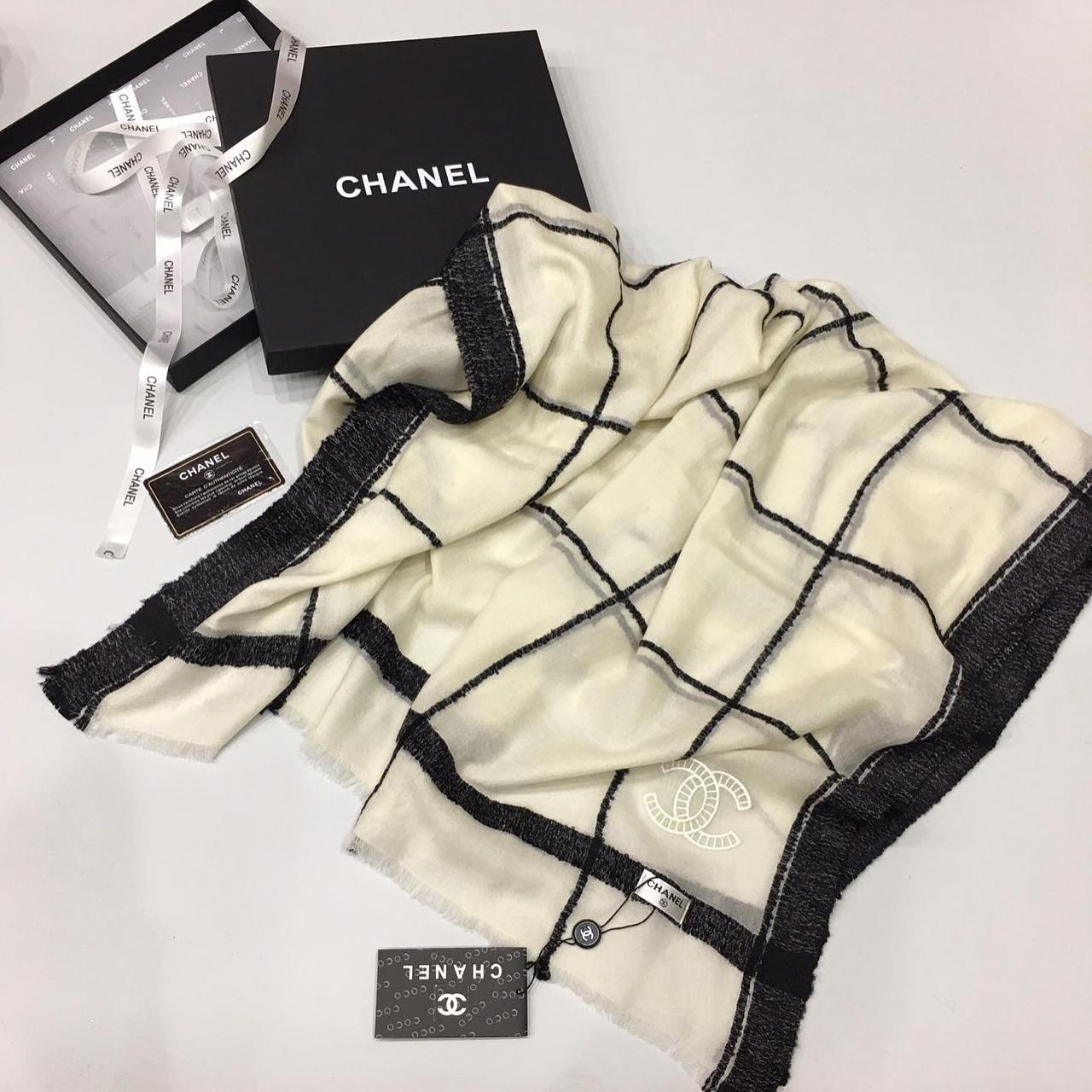 Палантин Chanel LUX-38979 — это элегантный аксессуар, выполненный в классическом стиле бренда. Аксессуар украшен клетчатым принтом и фирменным логотипом Chanel, что придает ему узнаваемость и шик. Он станет прекрасным дополнением к любому образу, от повседневного до вечернего.