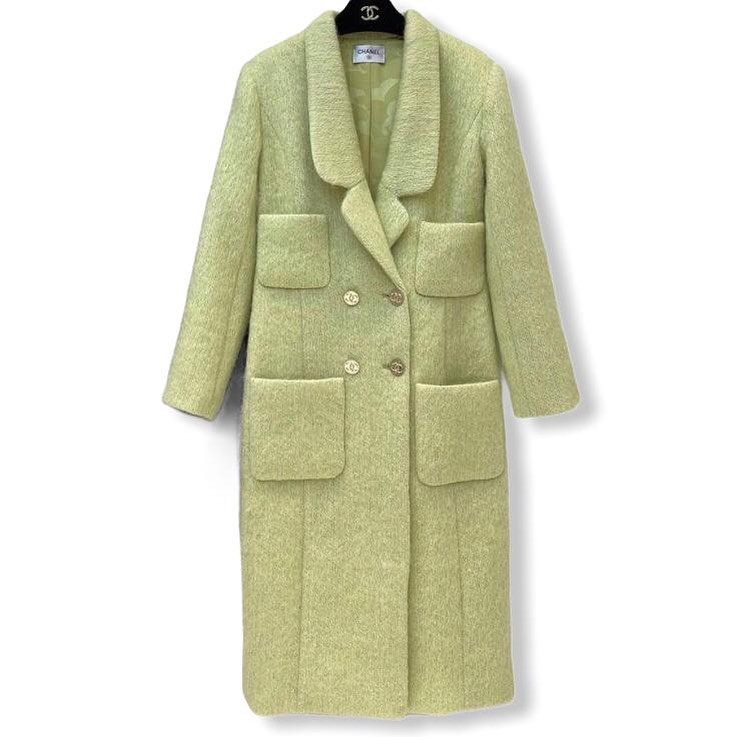 Это элегантное пальто Chanel LUX-44193 в нежном светло-зеленом оттенке. Модель выполнена в классическом стиле, идеально подходящем для создания изысканных образов. Пальто имеет двубортный крой, акцентированный крупными накладными карманами, которые добавляют изделию функциональности и стиля. Детали, такие как пуговицы с логотипом бренда, подчеркивают его эксклюзивность.