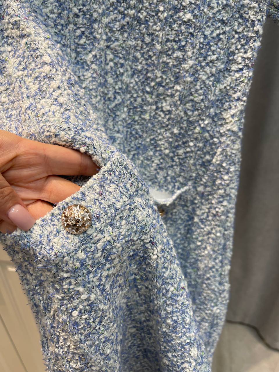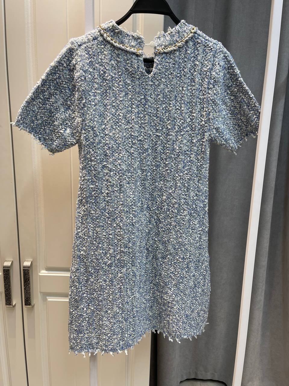Платье Chanel LUX-131694 выполнено в классическом стиле, идеально подходит для создания элегантного образа. Ткань с текстурой букле, короткий рукав и прямой силуэт делают его отличным выбором для различных мероприятий.