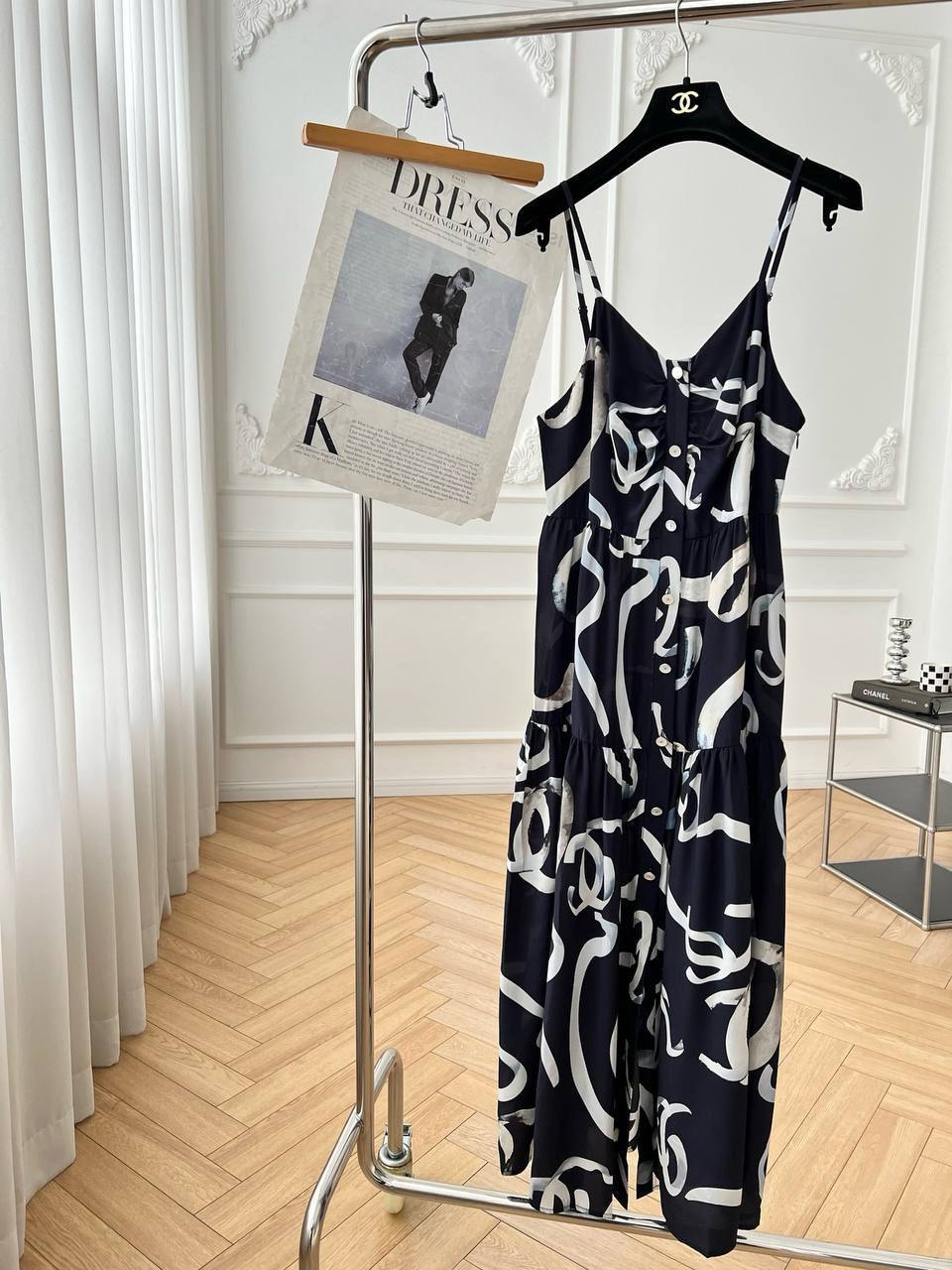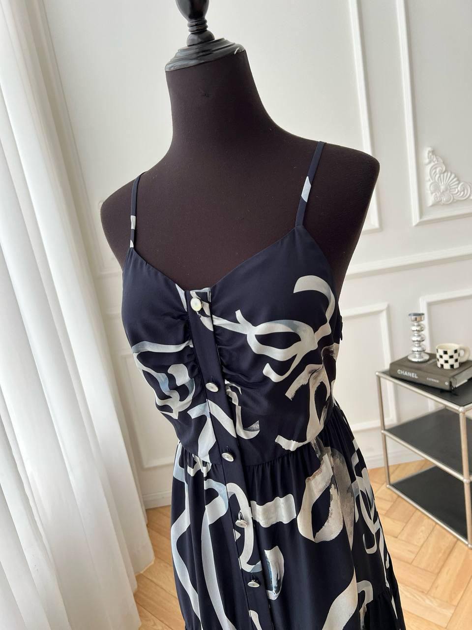 Платье Chanel LUX-131944 с узором в стиле логотипа бренда – элегантный выбор для создания женственного образа. Легкий, струящийся силуэт и изящные бретели подчеркивают утонченность.