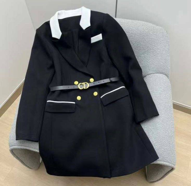 Платье **Chanel LUX-80888** — это элегантное платье-пиджак, выполненное в классическом стиле. Черный цвет с белыми контрастными элементами, золотые пуговицы и пояс с пряжкой добавляют изысканности. Отлично подойдет для деловых встреч или вечерних мероприятий.