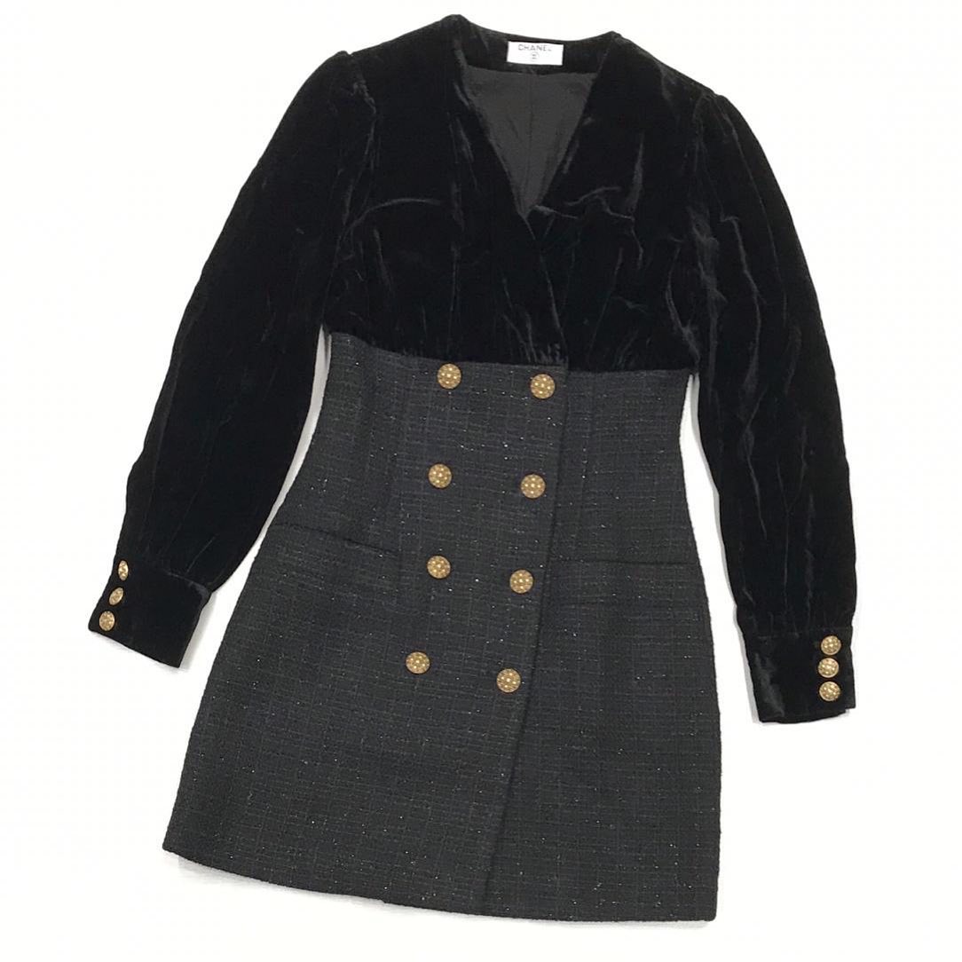 Это элегантное платье Chanel LUX-39457 сочетает в себе роскошный бархат и текстурированную ткань, создавая утонченный образ. Двубортный дизайн юбки с золотистыми пуговицами придает платью изысканность, а объемные рукава добавляют романтичности. Идеальный выбор для особых случаев, требующих безупречного стиля.