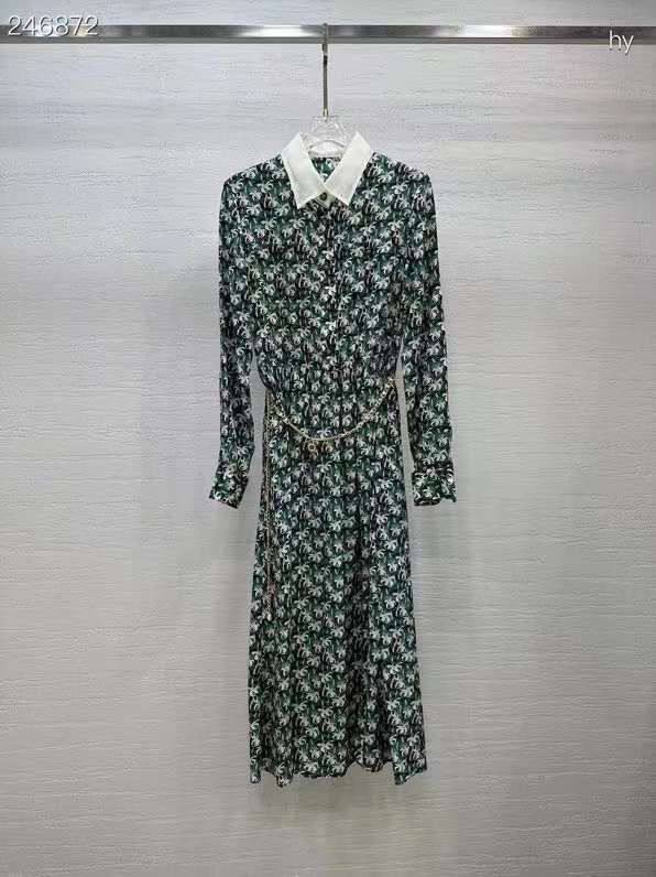 Платье Chanel LUX-96307 представляет собой элегантное платье с длинными рукавами и принтом, сочетающее в себе классический стиль и современный дизайн. Оно выполнено в темно-зеленом цвете с узором, а белый воротник добавляет контрастности и изысканности. Платье дополнено тонким поясом, подчеркивающим талию.