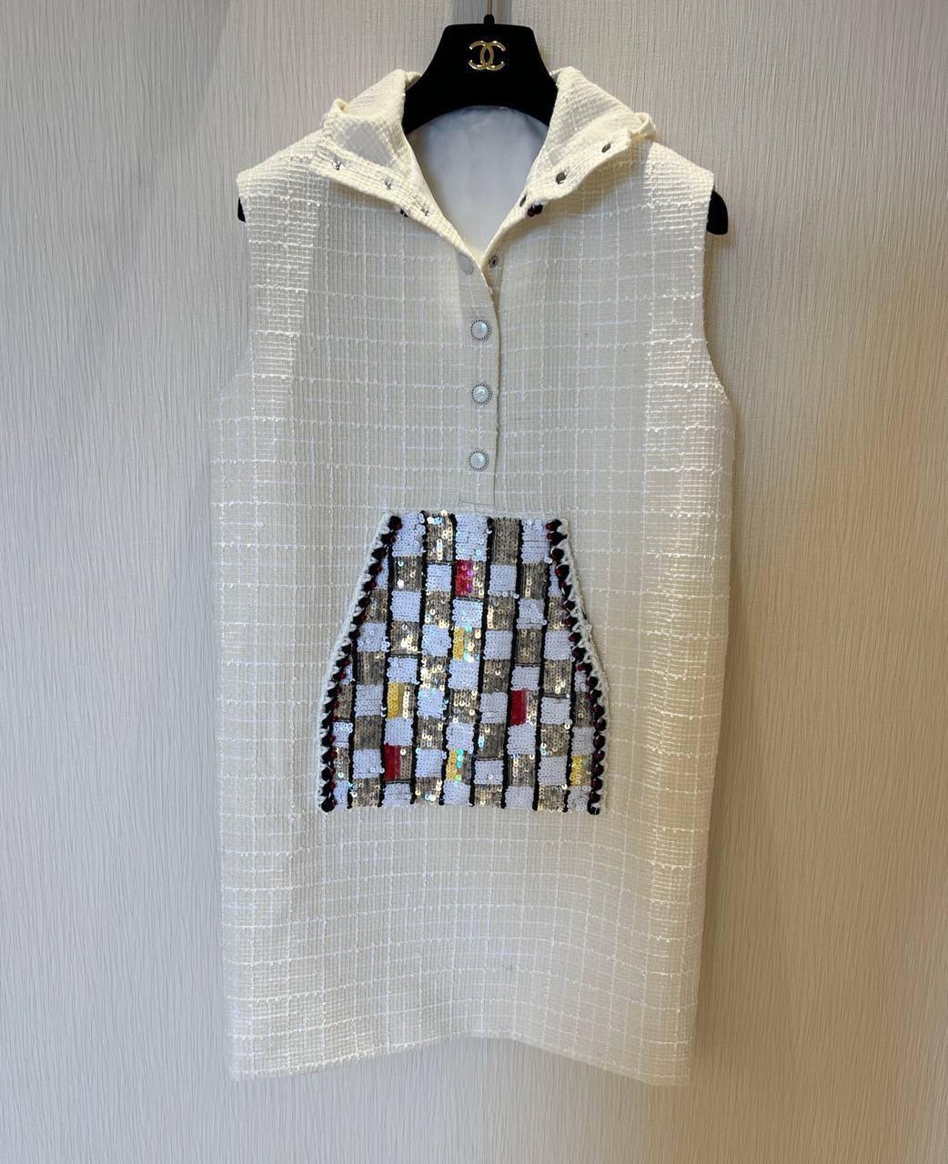 Платье Chanel LUX-114671 — воплощение элегантности и стиля. Это белое платье без рукавов, с небольшими пуговицами в верхней части и ярким элементом в виде декоративного кармана. Идеальный вариант для создания безупречного образа.