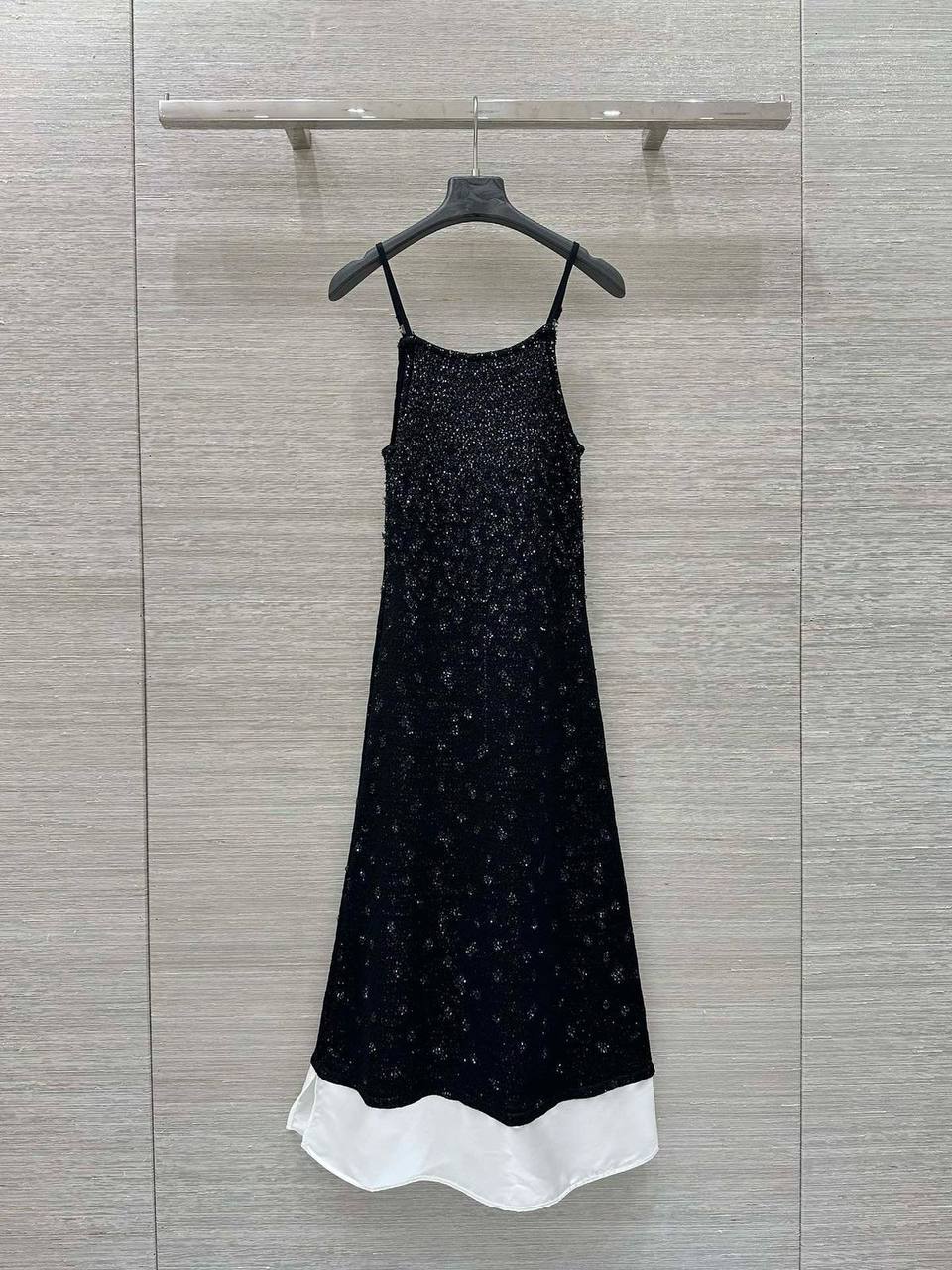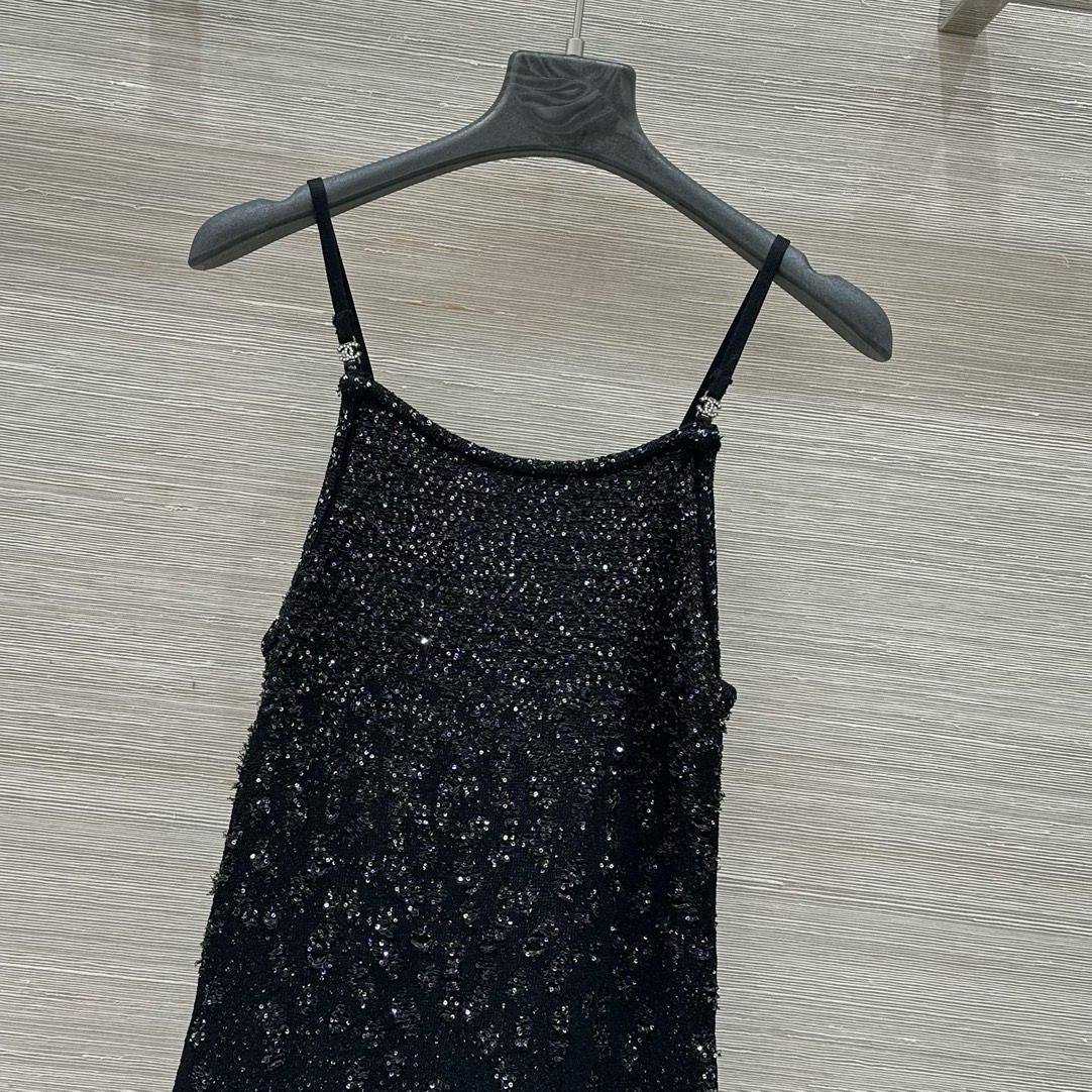 Платье Chanel LUX-117724 представляет собой элегантное платье на тонких бретелях, выполненное в стиле вечерней моды. Платье имеет черный основной цвет с блестящими деталями, а также контрастную белую отделку в нижней части. Оно подойдет для торжественных мероприятий и создания изысканного образа.