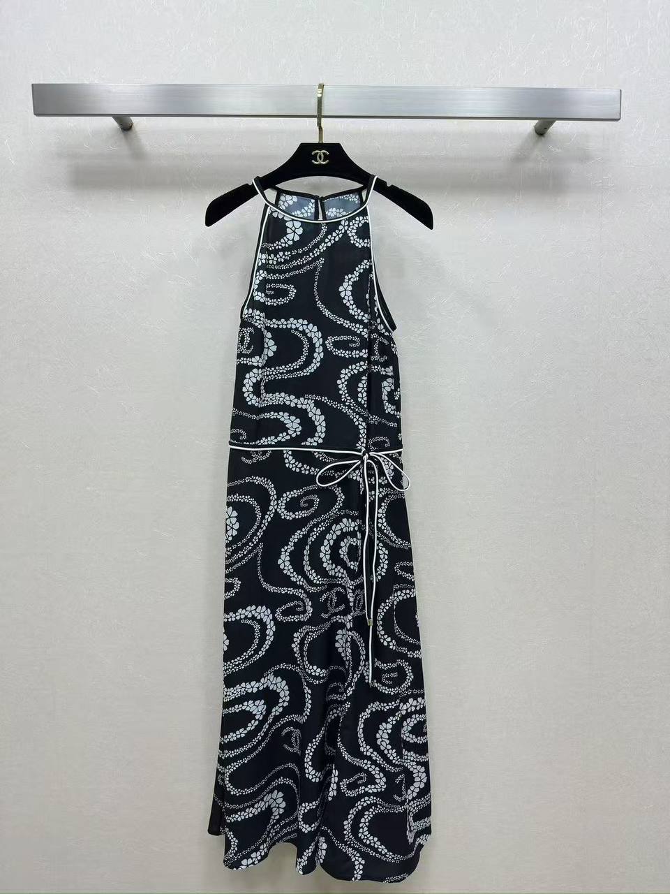 Платье Chanel LUX-119666 - это элегантное платье-халтер черного цвета с оригинальным узором в виде белых спиралей. Платье выполнено в классическом стиле Chanel, что делает его идеальным выбором для различных мероприятий. Оно сочетает в себе изысканность и современность.