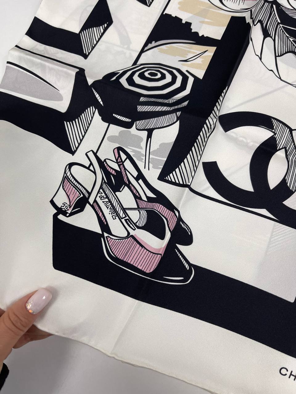 Платок Chanel LUX-86492 — это элегантный аксессуар от известного бренда. Платок выполнен в классическом стиле с графичным принтом в черно-белых тонах с добавлением розовых акцентов. Он идеально подойдет для создания утонченных образов.
