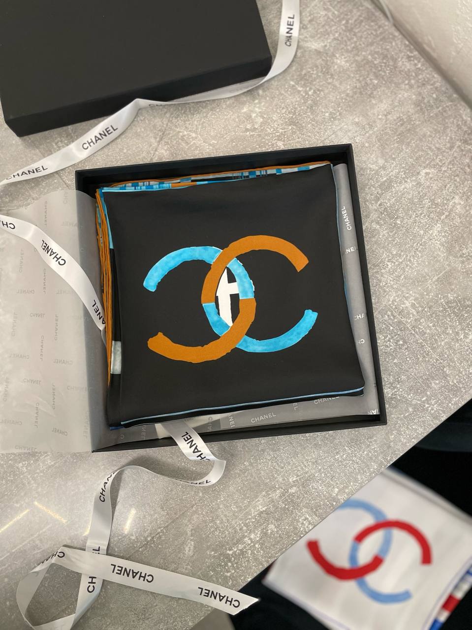 Платок Chanel LUX-101425 – это элегантный аксессуар для стильных образов. Яркий дизайн платка представлен сочетанием черного фона с голубыми и оранжевыми элементами логотипа бренда. Его можно использовать как шейный платок, повязку на голову или деталь для сумки.