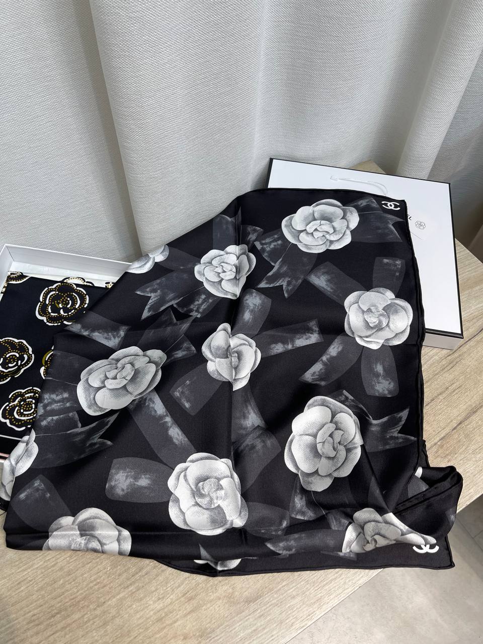 Платок Chanel LUX-130450 – это стильный аксессуар, который добавит элегантности любому образу. Он выполнен в классическом дизайне с узором из цветов и логотипом бренда.