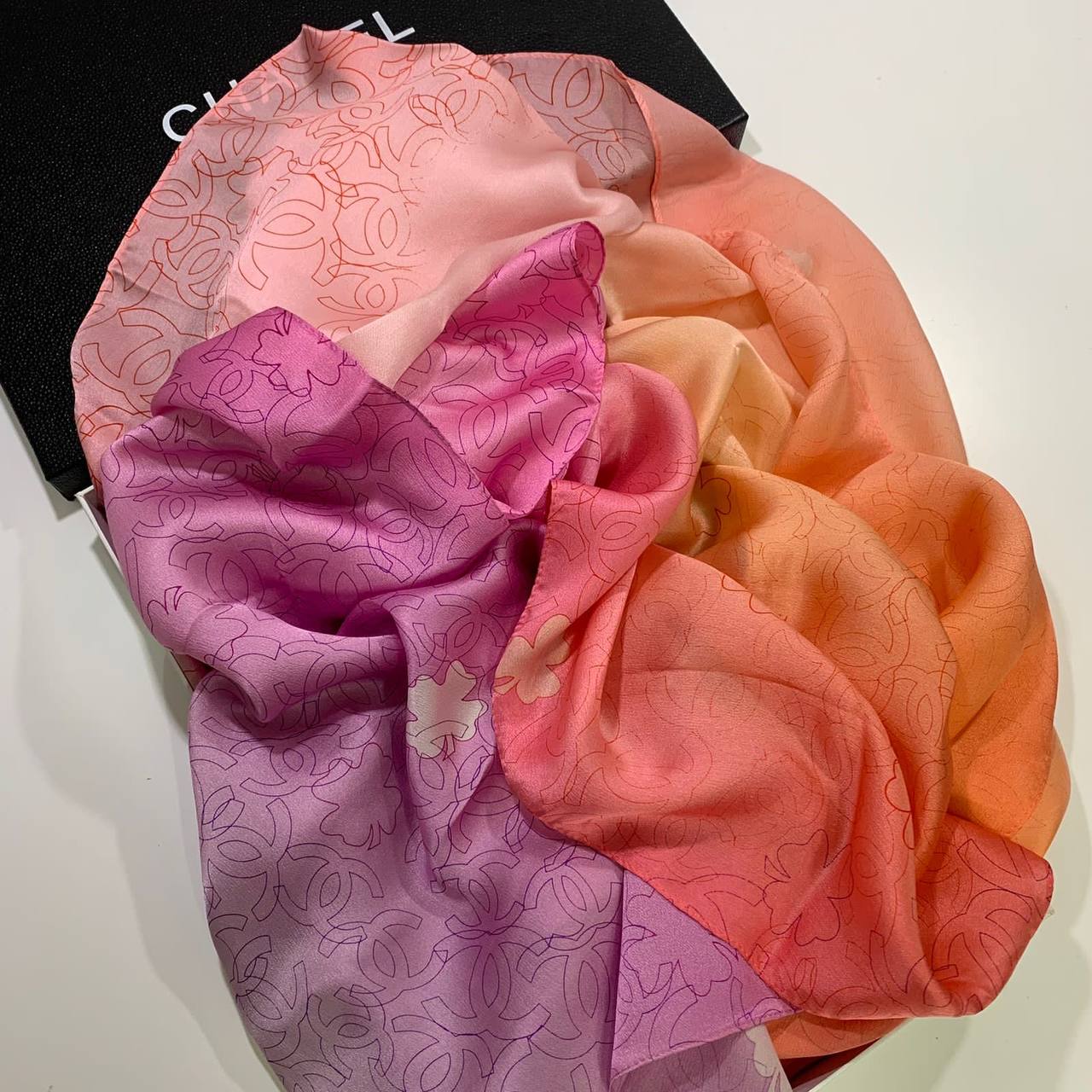 Этот шелковый платок Chanel LUX-66102 представляет собой элегантный аксессуар, выполненный в стиле бренда. Многогранный градиентный окрас, переходящий от нежно-розового к ярко-сиреневому и персиковому, создает игру цвета и придает изделию легкость. Деликатный, повторяющийся узор из логотипа Chanel и цветочных мотивов подчеркивает роскошь и утонченность.