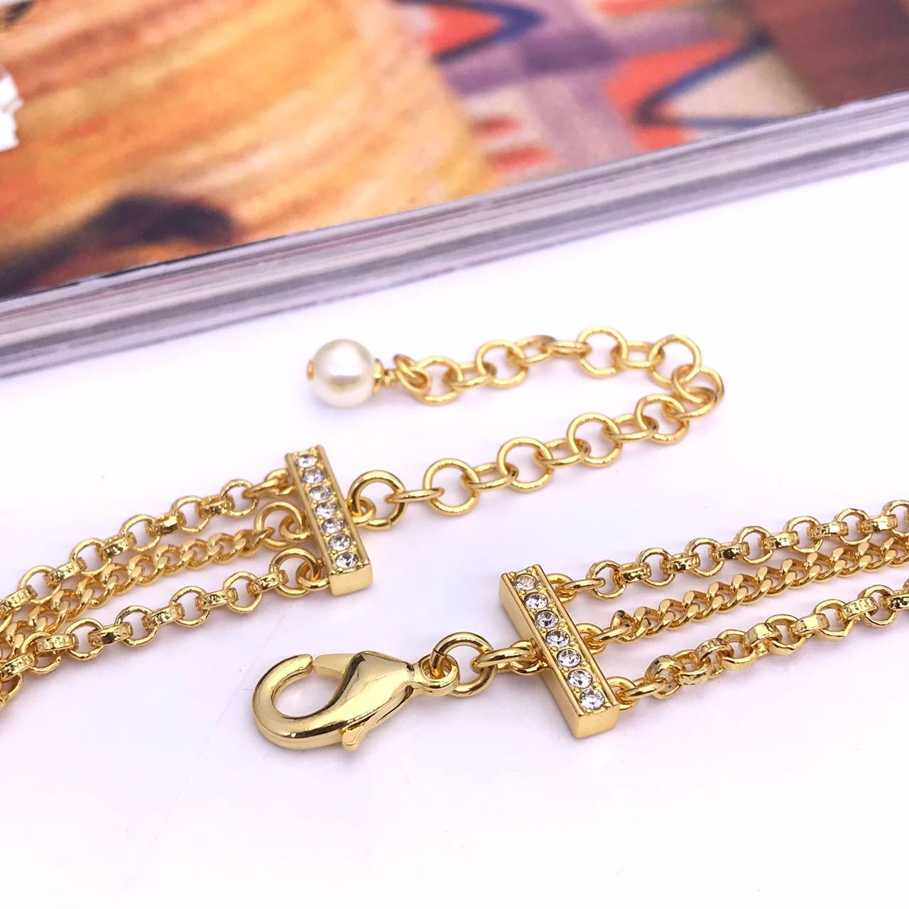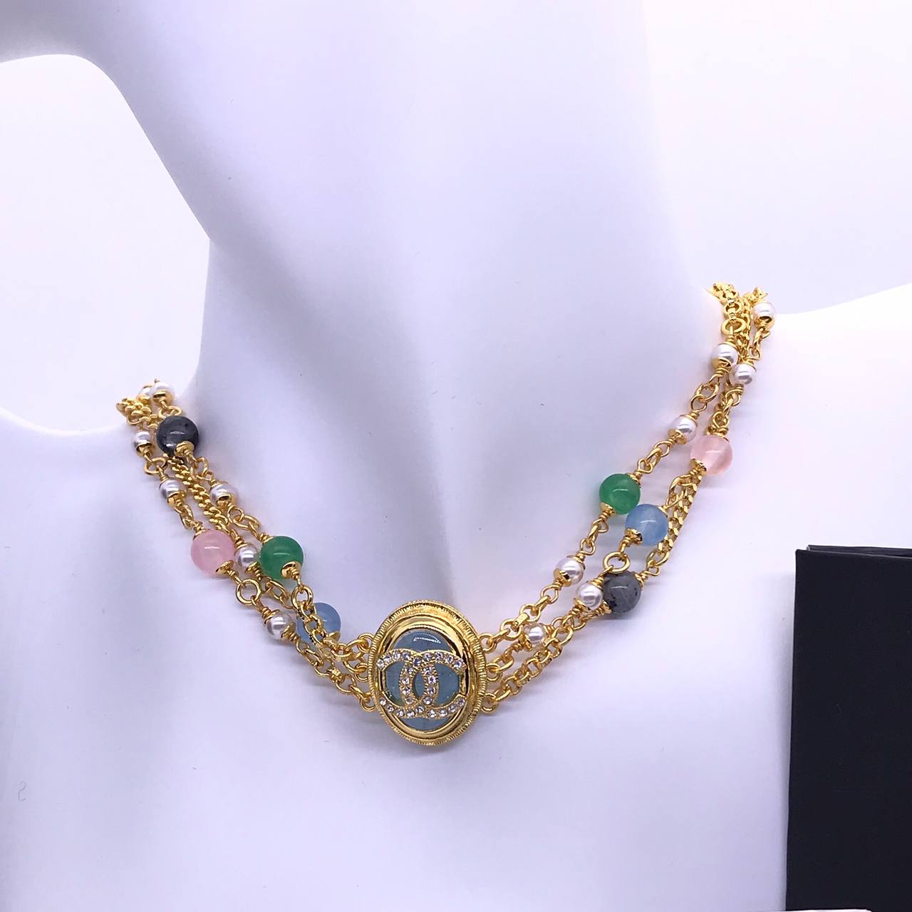 Подвеска Chanel LUX-83257 представляет собой изысканное украшение в стиле французского дома моды. Золотистая цепочка в несколько рядов дополнена разноцветными бусинами и центральной подвеской с логотипом бренда и инкрустацией. Подвеска станет прекрасным дополнением к повседневному или вечернему образу.