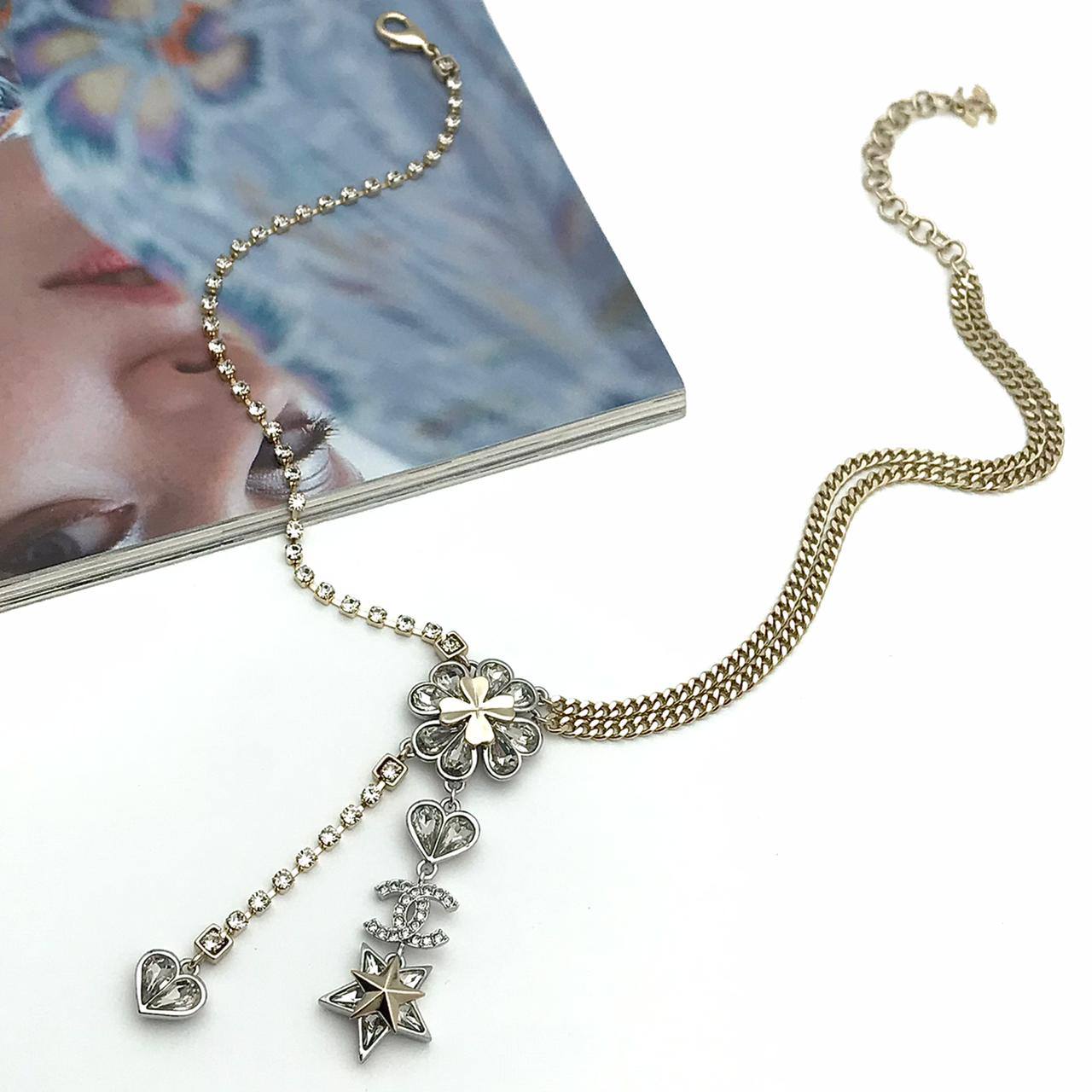 Подвеска Chanel LUX-91704 представляет собой изысканное украшение в виде ожерелья, сочетающее в себе классический стиль и современный дизайн. Основным акцентом является подвеска с элементами в виде сердца, звезды, и логотипом бренда. Золотистая цепочка гармонично дополняет общую композицию.