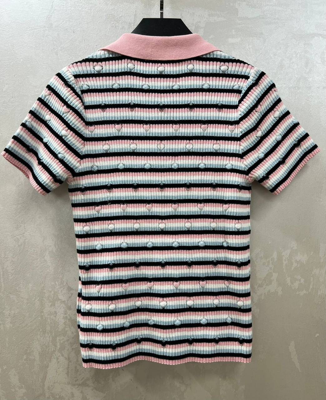 Поло Chanel LUX-119198 - это стильная женская рубашка-поло в полоску. Она выполнена в сочетании розового, черного, белого и голубого цветов. Данный предмет гардероба предназначен для повседневной носки, добавляя образу элегантности и комфорта.