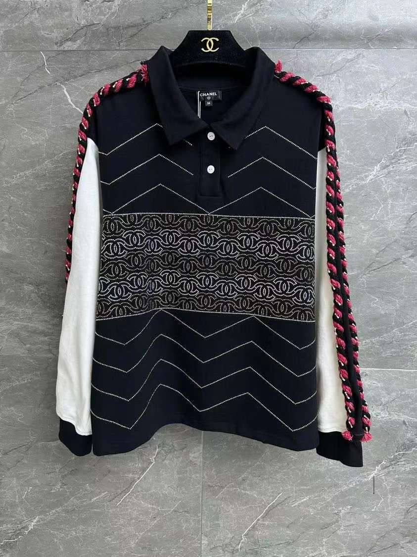 Поло Chanel LUX-95298 выполнено в спортивном стиле с добавлением роскоши и элегантности. Комбинация чёрного, белого и розового цветов, а также декоративные элементы в виде косичек и узоров создают уникальный и запоминающийся образ. Поло идеально подойдет для создания как повседневных, так и более нарядных образов.